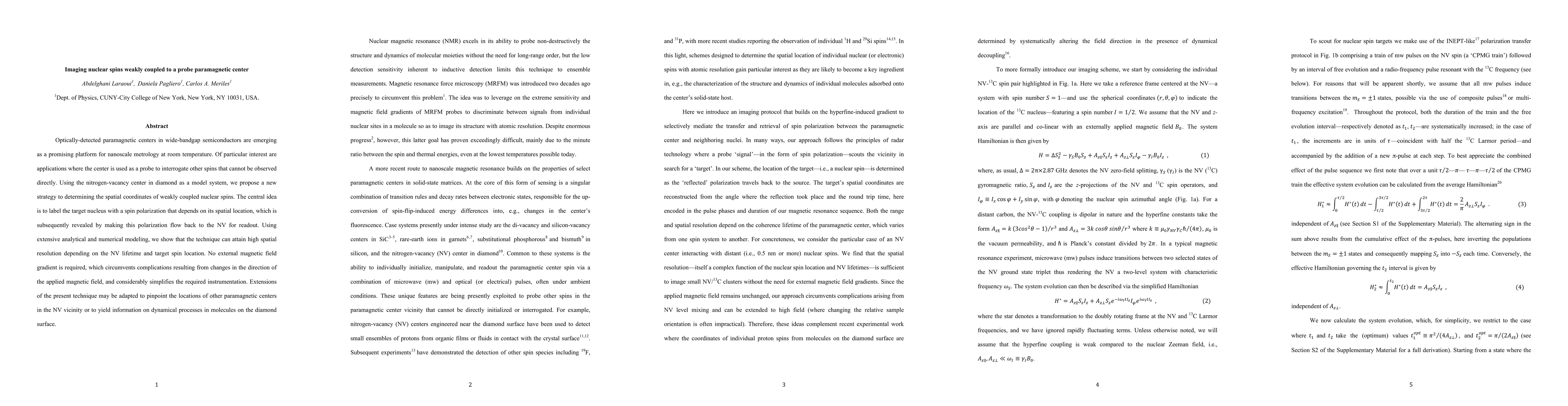This paper proposes a novel method for determining the spatial coordinates of weakly coupled nuclear spins using optically-detected paramagnetic centers in wide-bandgap semiconductors, specifically the nitrogen-vacancy center in diamond. The technique leverages spin polarization labeling and flow back to the NV center for readout, achieving high spatial resolution without requiring external magnetic field gradients.