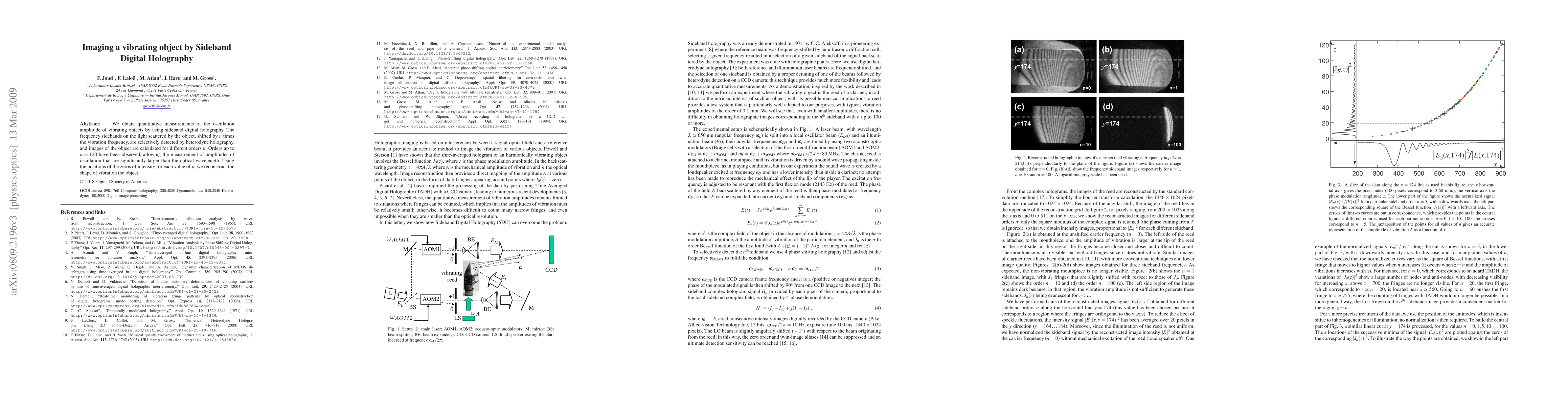 We obtain quantitative measurements of the oscillation amplitude of vibrating objects by using sideband digital holography. The frequency sidebands on the light scattered by the object, shifted by n times the vibration frequency, are selectively detected by heterodyne holography, and images of the object are calculated for different orders n. Orders up to n=120 have been observed, allowing the measurement of amplitudes of oscillation that are significantly larger than the optical wavelength. Using the positions of the zeros of intensity for each value of n, we reconstruct the shape of vibration the object.