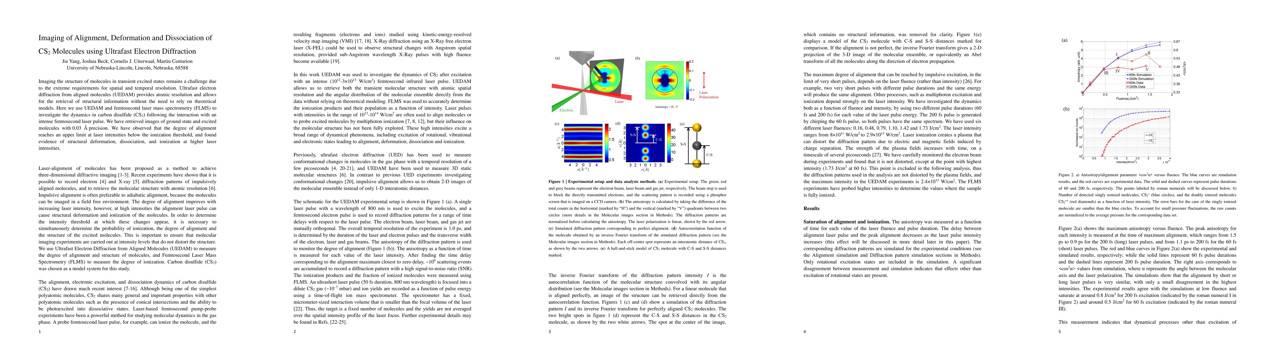 This study employs ultrafast electron diffraction and femtosecond laser mass spectrometry to capture the dynamics of carbon disulfide (CS2) molecules post intense laser pulse interaction. The technique reveals structural deformation, dissociation, and ionization at higher laser intensities, with 0.03 Å precision.