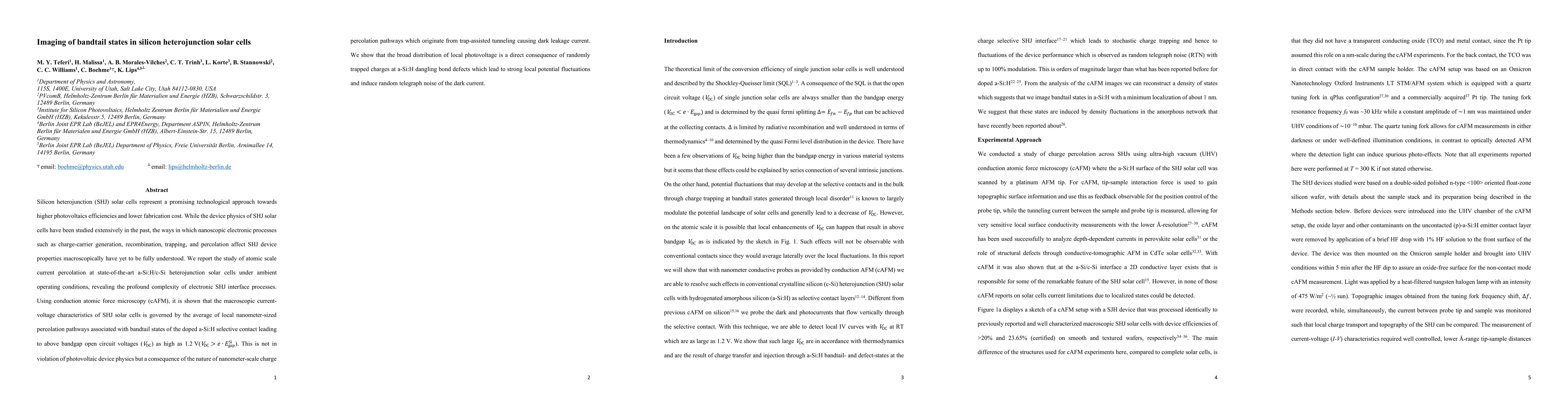 This paper investigates the electronic processes in silicon heterojunction (SHJ) solar cells using conduction atomic force microscopy (cAFM), revealing that macroscopic current-voltage characteristics are influenced by nanometer-sized percolation pathways associated with bandtail states. The study finds that high open circuit voltages result from trap-assisted tunneling and local potential fluctuations due to a-Si:H dangling bond defects, leading to random telegraph noise in dark current.