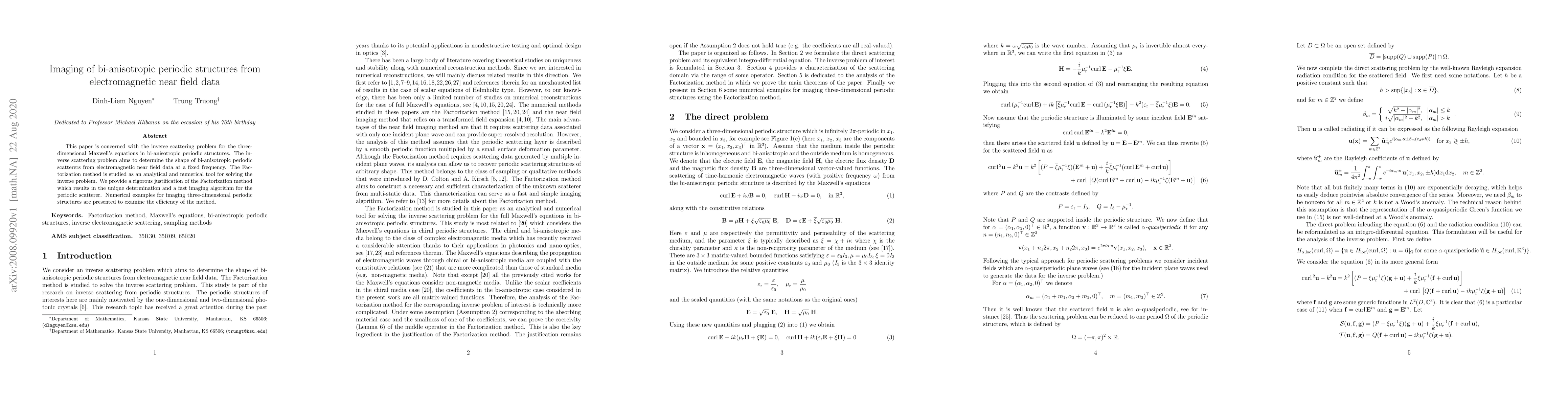 This paper presents a Factorization method for solving the inverse scattering problem to determine the shape of bi-anisotropic periodic structures from electromagnetic near field data. The method provides a unique determination and a fast imaging algorithm, validated through numerical examples.