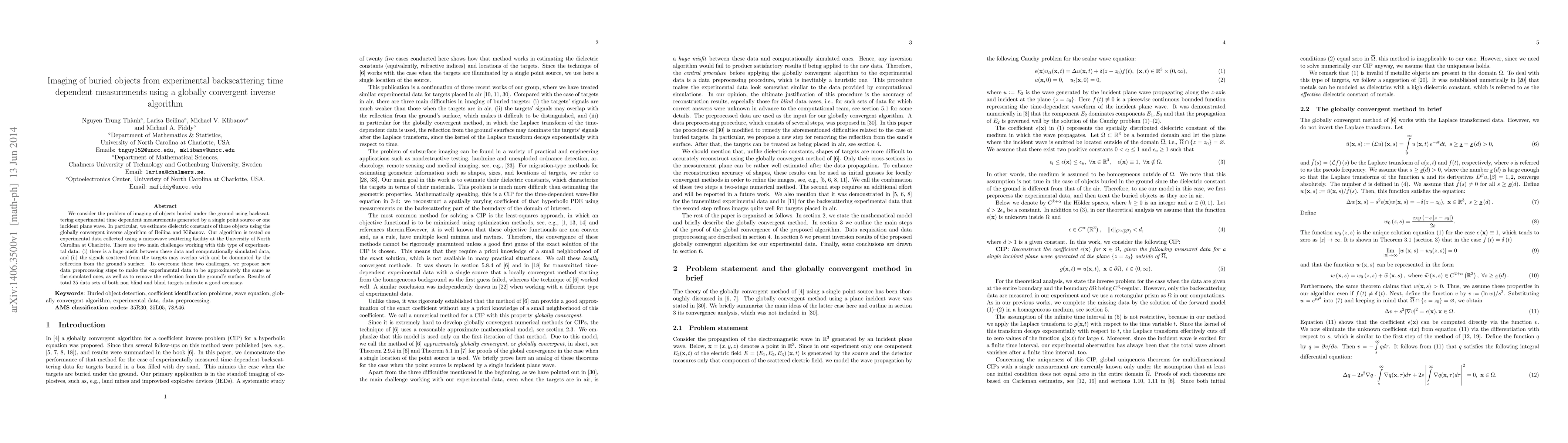This paper presents an imaging technique for buried objects using backscattering time-dependent measurements and a globally convergent inverse algorithm. The proposed method addresses data misfit and ground reflection issues through new preprocessing steps, achieving good accuracy in imaging based on experimental microwave data.