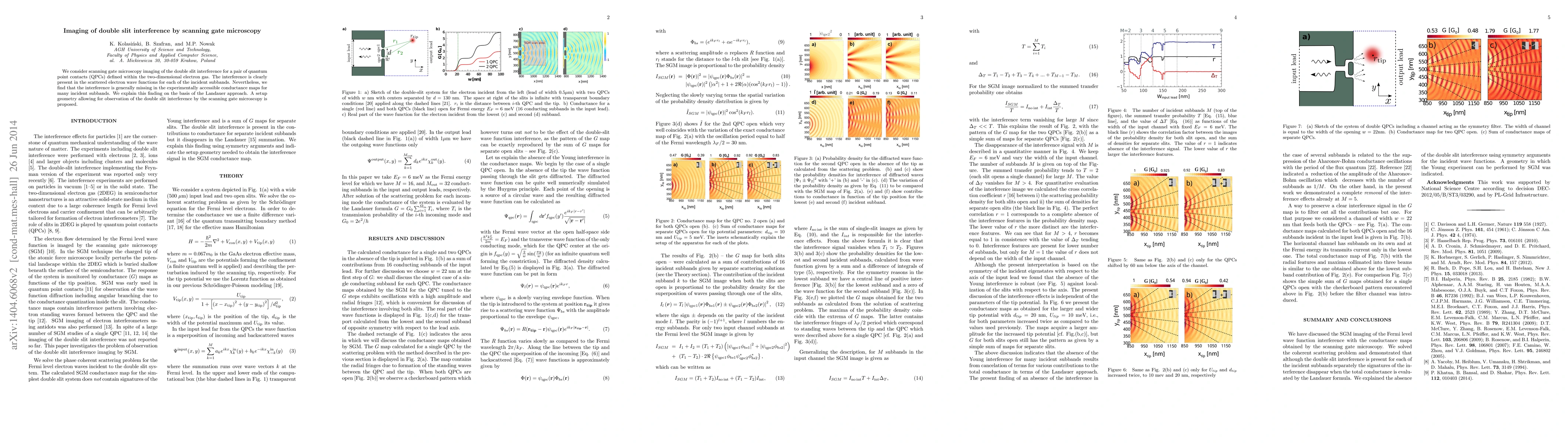 This paper investigates the imaging of double slit interference using scanning gate microscopy for quantum point contacts within a two-dimensional electron gas. While interference is evident in electron wave functions, conductance maps often lack this interference, which is explained through the Landauer approach. The study proposes a geometry setup to potentially observe this interference.
