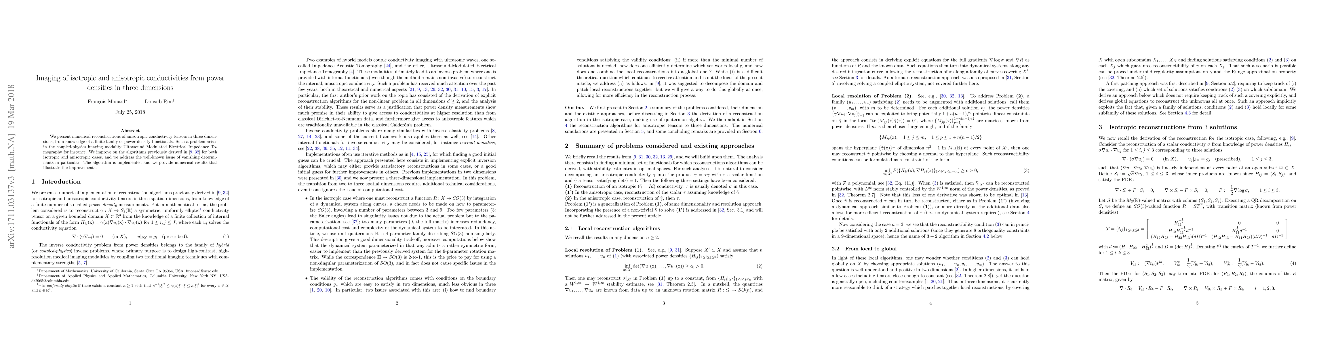 Researchers developed a new algorithm to reconstruct anisotropic conductivity tensors from power densities in 3D, improving on previous methods and addressing the issue of vanishing determinants.