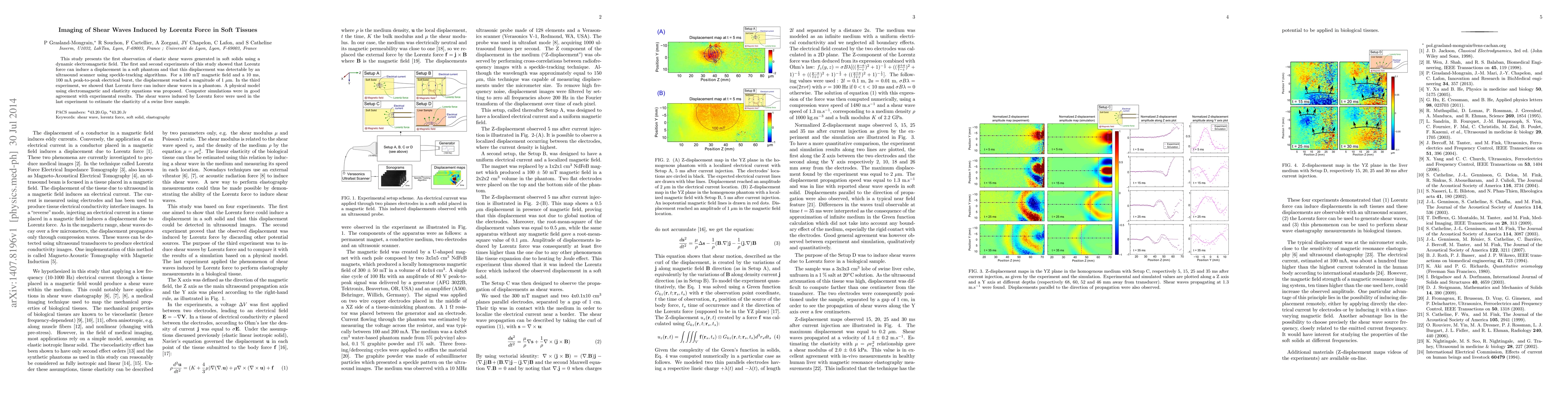 This study demonstrates the generation of elastic shear waves in soft tissues via Lorentz force induced by dynamic electromagnetic fields, detectable via ultrasound speckle-tracking. The research also estimates the elasticity of a swine liver sample using these induced shear waves, supported by a model and simulations.