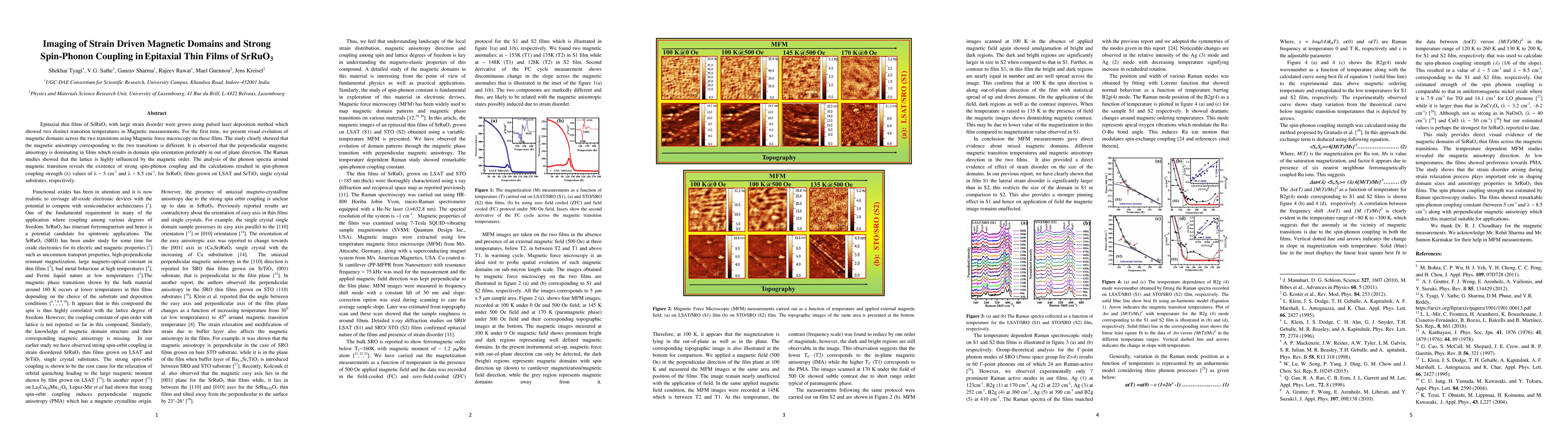 This paper investigates epitaxial SrRuO3 thin films grown via pulsed laser deposition, revealing distinct magnetic domain evolution across two transition temperatures using Magnetic force microscopy. The study identifies strong spin-phonon coupling with calculated coupling strengths of ~5 cm-1 and ~8.5 cm-1 for different substrates, indicating significant lattice influence by magnetic order.