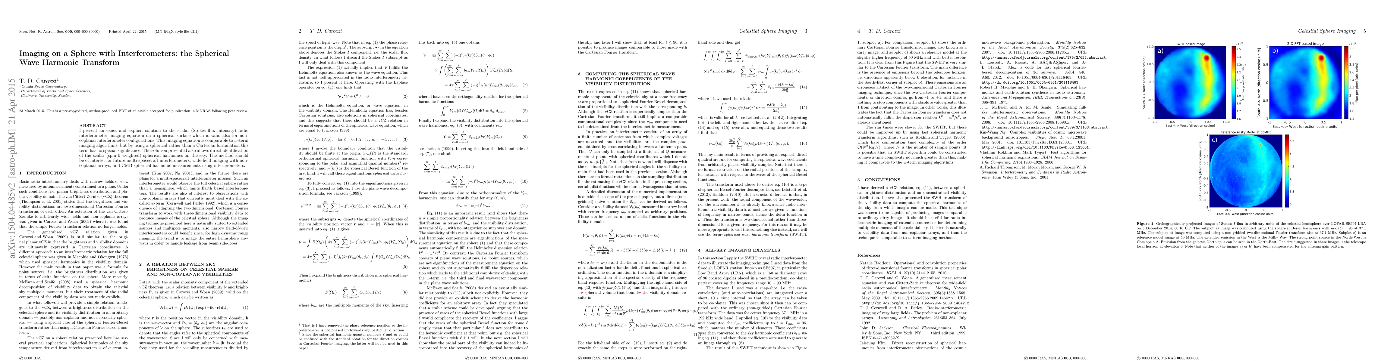 This paper provides an exact solution for radio interferometer imaging on a spherical surface, applicable to non-coplanar configurations. It introduces a spherical wave harmonic transform, facilitating direct identification of scalar spherical harmonics, with potential applications for multi-spacecraft interferometers and CMB measurements.