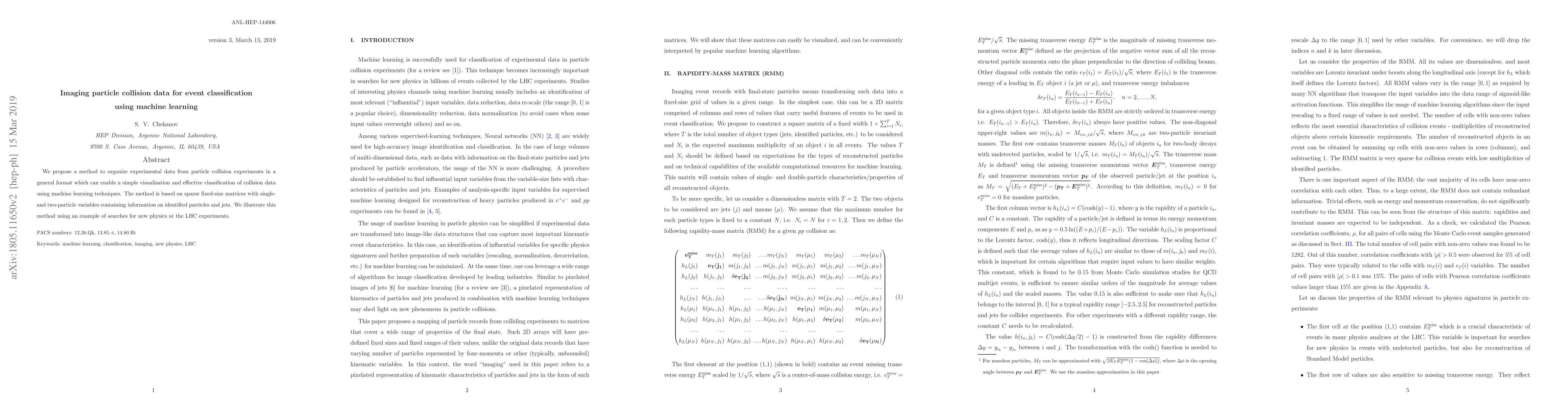 This paper proposes a method to organize particle collision data using sparse matrices for visualization and machine learning classification, focusing on identifying new physics in LHC experiments. The method simplifies data representation and enhances classification effectiveness.