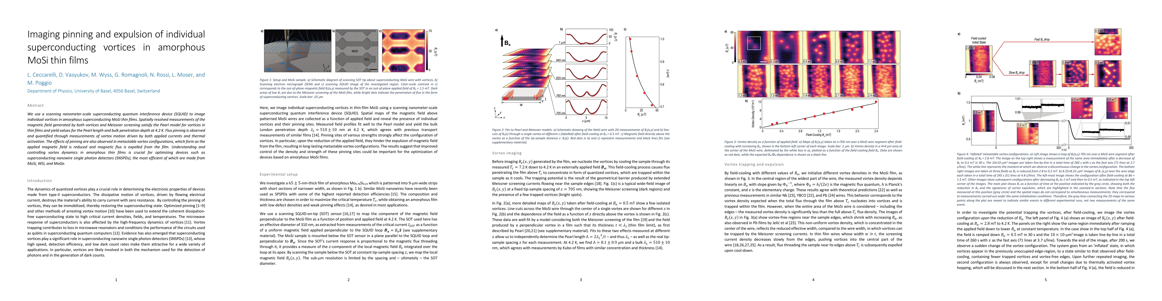 This paper uses a SQUID to visualize individual superconducting vortices in amorphous MoSi thin films, confirming the Pearl model and measuring related parameters. The study quantifies flux pinning and vortex expulsion effects, highlighting the significance for improving devices like superconducting nanowire single photon detectors.