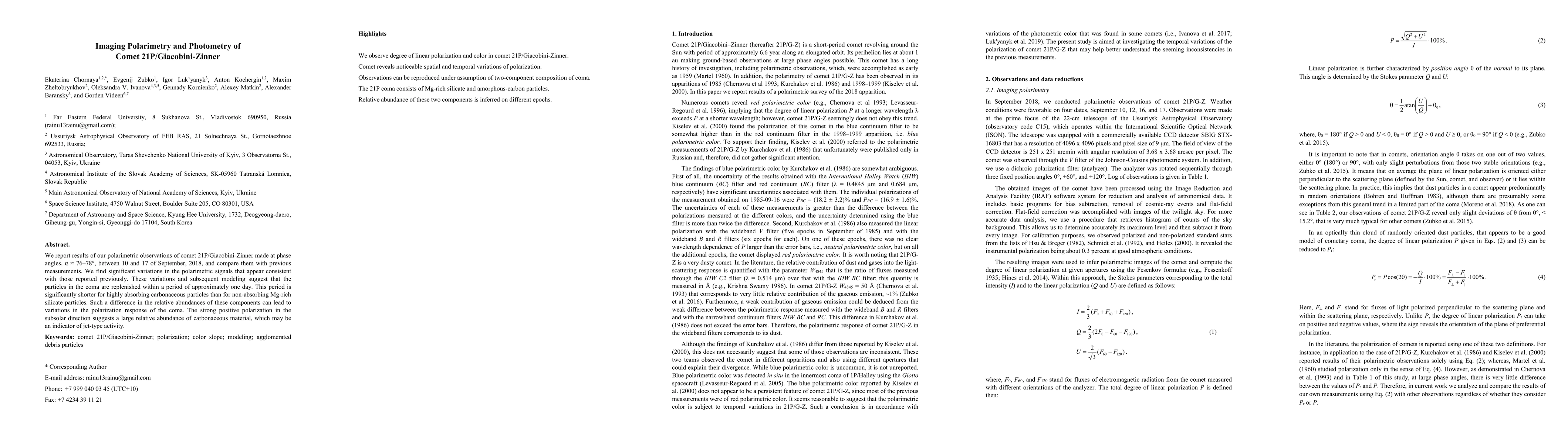 Researchers studied comet 21P/Giacobini-Zinner's polarimetric signals during 2018, finding significant variations that suggest particles in the coma are replenished every day, with a shorter period for carbonaceous particles.