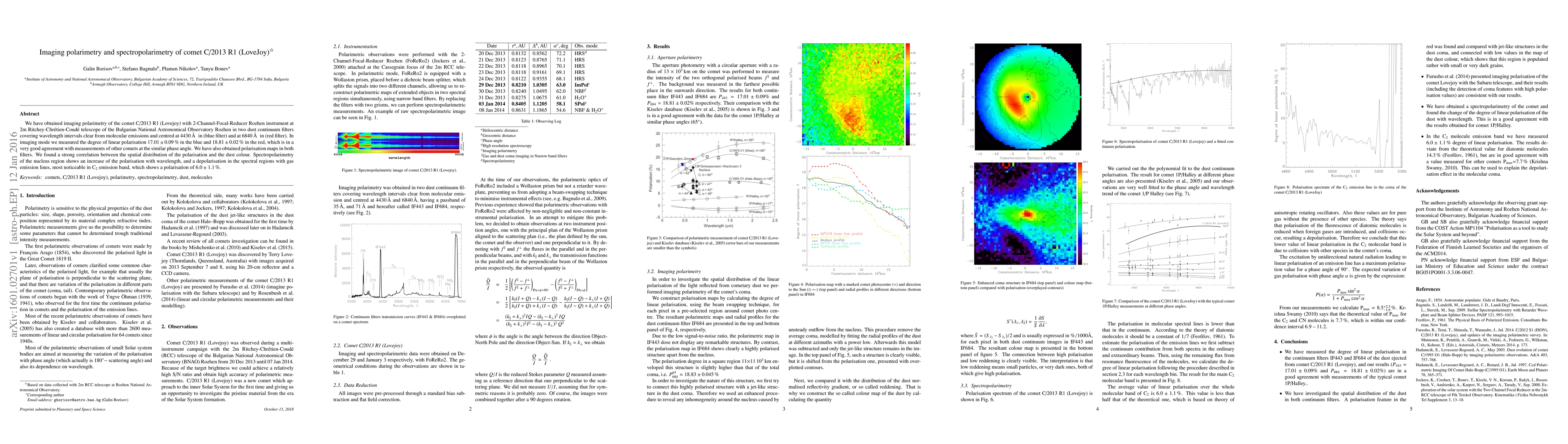 We have obtained imaging polarimetry of the comet C/2013 R1 (Lovejoy) with 2-Channel-Focal-Reducer Rozhen instrument at 2m Ritchey-Chr\'etien-Coud\'e telescope of the Bulgarian National Astronomical Observatory Rozhen in two dust continuum filters covering wavelength intervals clear from molecular emissions and centred at $4430\AA$ in (blue filter) and at $6840\AA$ in (red filter). In imaging mode we measured the degree of linear polarisation $17.01\pm0.09$% in the blue and $18.81\pm0.02$% in the red, which is in a very good agreement with measurements of other comets at the similar phase angle. We have also obtained polarisation maps in both filters. We found a strong correlation between the spatial distribution of the polarisation and the dust colour. Spectropolarimetry of the nucleus region shows an increase of the polarisation with wavelength, and a depolarisation in the spectral regions with gas emission lines, most noticeable in C$_2$ emission band, which shows a polarisation of $6.0\pm1.1$%.