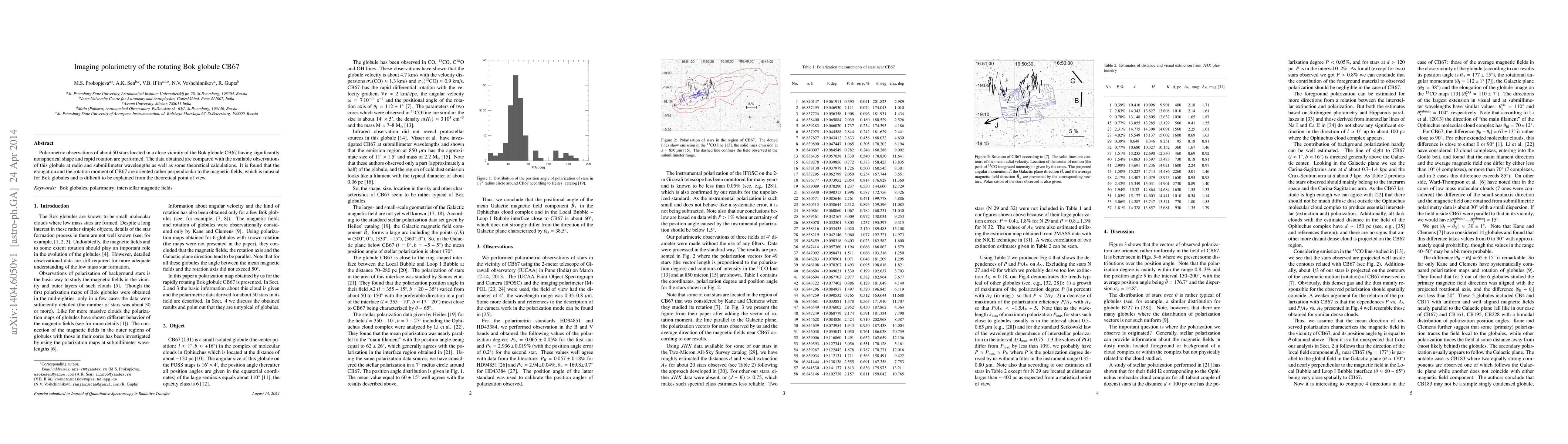 Polarimetric observations of about 50 stars located in a close vicinity of the Bok globule CB67 having significantly nonspherical shape and rapid rotation are performed. The data obtained are compared with the available observations of this globule at radio and submillimeter wavelengths as well as some theoretical calculations. It is found that the elongation and the rotation moment of CB67 are oriented rather perpendicular to the magnetic fields, which is unusual for Bok globules and is difficult to be explained from the theoretical point of view.