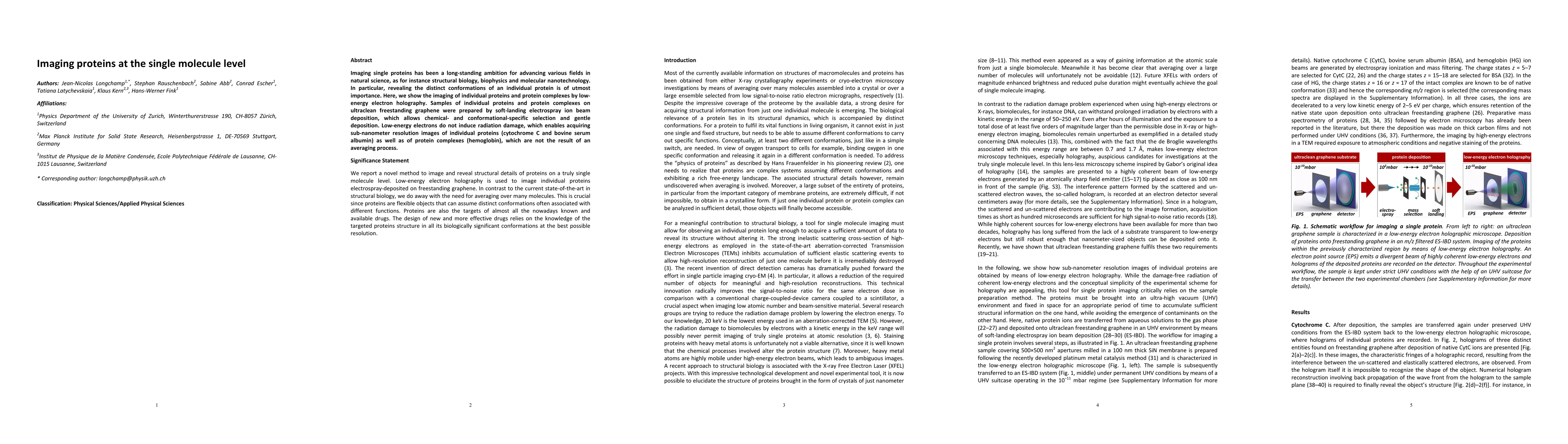 This paper demonstrates the imaging of individual proteins and protein complexes using low-energy electron holography, achieving sub-nanometer resolution without radiation damage. The method employs soft-landing electrospray ion beam deposition on ultraclean graphene for gentle sample preparation.