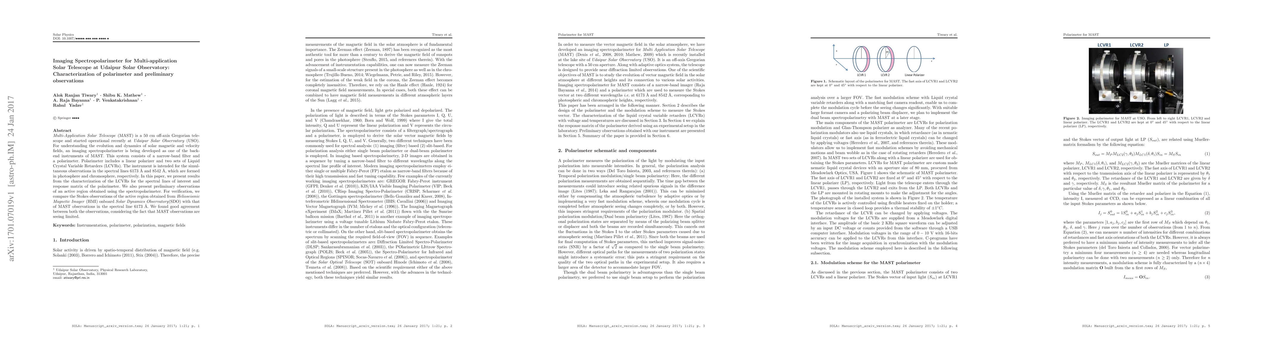 Multi-Application Solar Telescope (MAST) is a 50 cm off-axis Gregorian telescope and started operational recently at Udaipur Solar Observatory (USO). For understanding the evolution and dynamics of solar magnetic and velocity fields, an imaging spectropolarimeter is being developed as one of the back-end instruments of MAST. This system consists of a narrow-band filter and a polarimeter. Polarimeter includes a linear polarizer and two sets of Liquid Crystal Variable Retarders (LCVRs). The instrument is intended for the simultaneous observations in the spectral lines 617.3 nm and 854.2 nm, which are formed in photosphere and chromosphere, respectively. In this paper, we present results from the characterization of the LCVRs for the spectral lines of interest and response matrix of the polarimeter. We also present preliminary observations of an active region obtained using the spectropolarimeter. For verification, we compare the Stokes observations of the active region obtained from Helioseismic Magnetic Imager (HMI) onboard Solar Dynamics Observatory (SDO) with that of MAST observations in the spectral line 617.3 nm. We found good agreement between both the observations, considering the fact that MAST observations are seeing limited.