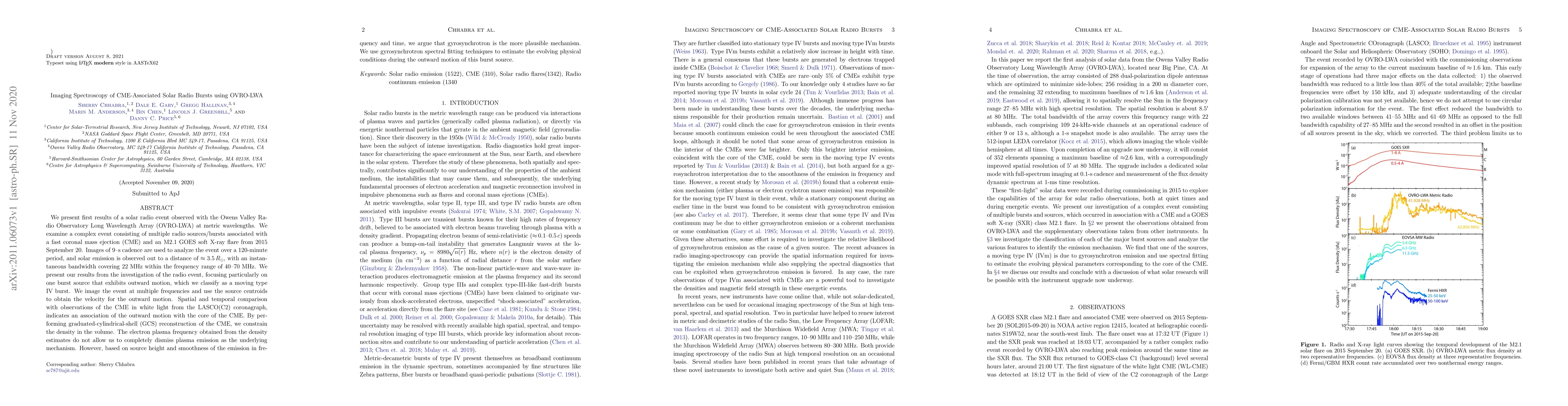 This study investigates a solar radio event observed with the OVRO-LWA, focusing on a moving type IV burst associated with a CME and an M2.1 flare. The analysis suggests gyrosynchrotron emission as the likely mechanism for the burst, supported by spatial and temporal correlations with the CME and spectral fitting techniques.