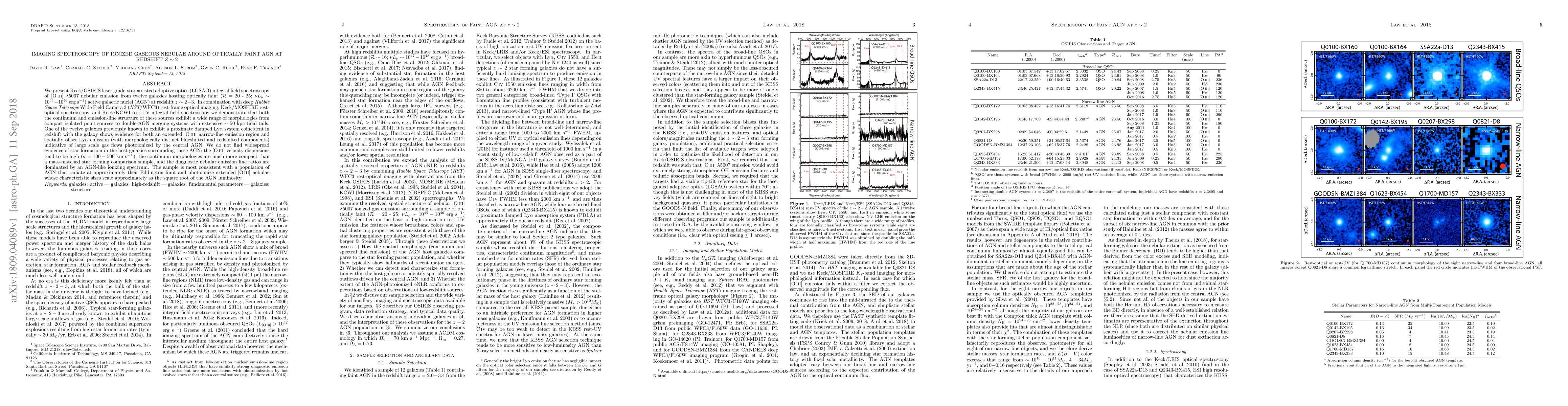 This study uses Keck/OSIRIS adaptive optics imaging spectroscopy to analyze ionized gas nebulae around twelve faint AGN at redshift z ~ 2-3, revealing a variety of emission-line and continuum morphologies. The findings suggest these AGN photoionize extended [O III] nebulae, with little evidence of star formation, supporting a population of AGN radiating near their Eddington limit.