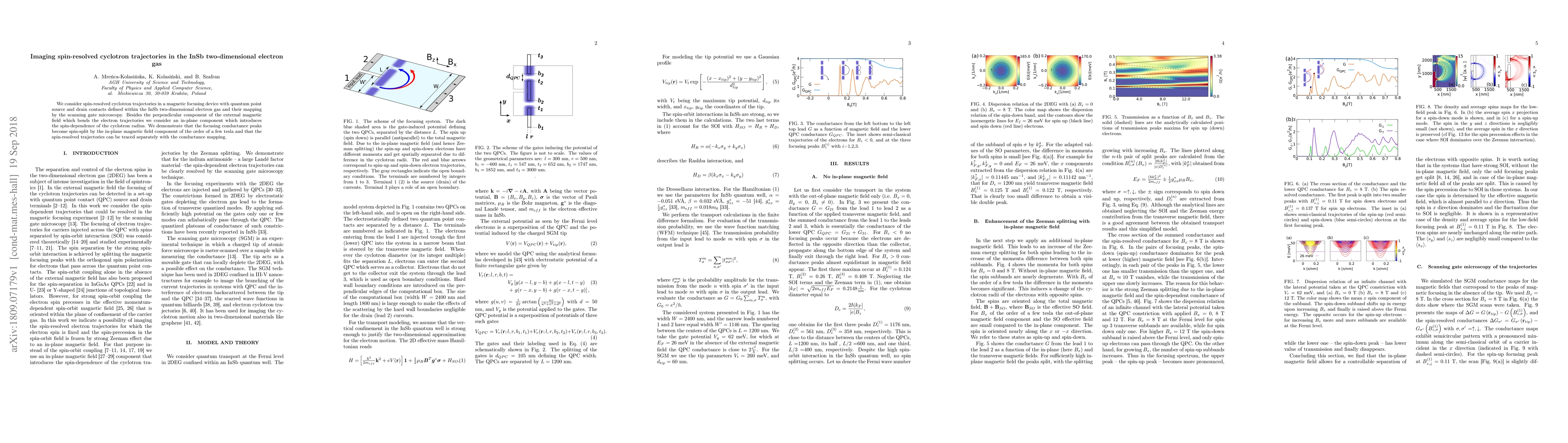 This paper investigates spin-resolved cyclotron trajectories in an InSb two-dimensional electron gas under the influence of both perpendicular and in-plane magnetic fields, revealing spin-splitting of focusing conductance peaks and enabling separate mapping of spin-resolved trajectories via scanning gate microscopy.