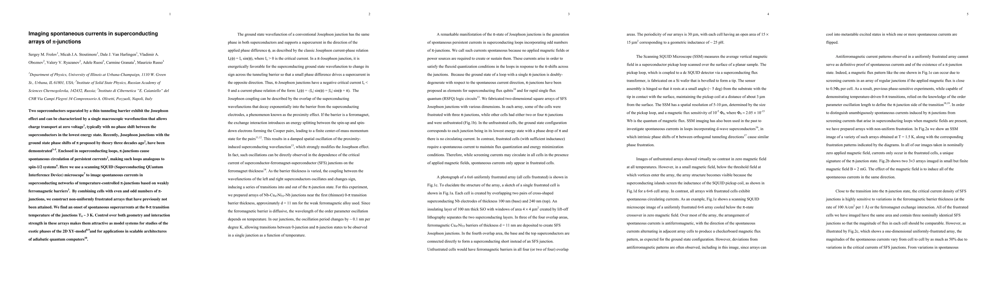 This study uses a scanning SQUID microscope to image spontaneous zero-field currents in superconducting arrays of pi-junctions, finding the onset of supercurrents at the 0-pi transition temperature. These networks, consisting of arrays with even and odd numbers of pi-junctions, serve as model systems for studying exotic phases and scalable quantum computing.