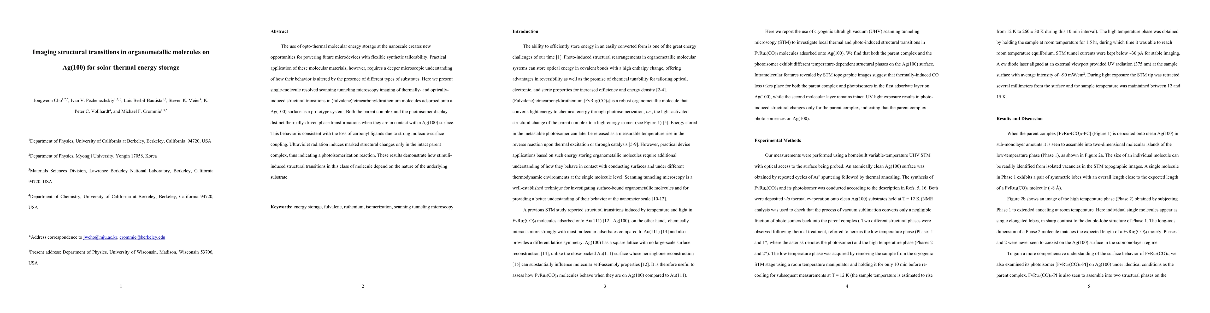 The use of opto-thermal molecular energy storage at the nanoscale creates new opportunities for powering future microdevices with flexible synthetic tailorability. Practical application of these molecular materials, however, requires a deeper microscopic understanding of how their behavior is altered by the presence of different types of substrates. Here we present single-molecule resolved scanning tunneling microscopy imaging of thermally- and optically-induced structural transitions in (fulvalene)tetracarbonyldiruthenium molecules adsorbed onto a Ag(100) surface as a prototype system. Both the parent complex and the photoisomer display distinct thermally-driven phase transformations when they are in contact with a Ag(100) surface. This behavior is consistent with the loss of carbonyl ligands due to strong molecule-surface coupling. Ultraviolet radiation induces marked structural changes only in the intact parent complex, thus indicating a photoisomerization reaction. These results demonstrate how stimuli-induced structural transitions in this class of molecule depend on the nature of the underlying substrate.