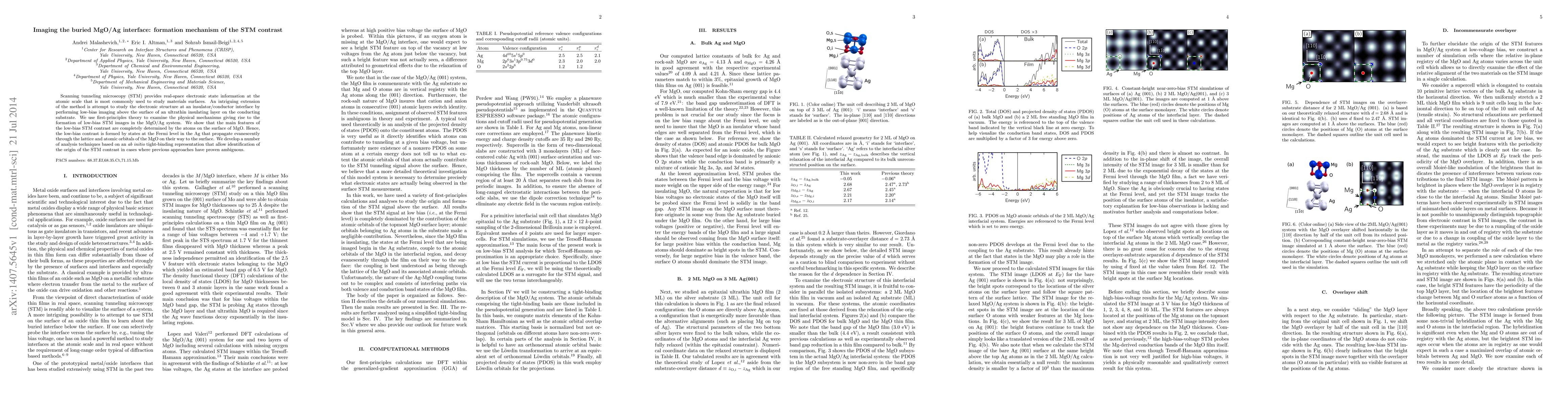 This paper uses first-principles theory to investigate the mechanisms behind the formation of low-bias STM contrast at the buried MgO/Ag interface, revealing that surface atoms of MgO and evanescently propagating Ag states determine the contrast. The study introduces ab initio tight-binding techniques to clarify the origin of STM contrast.