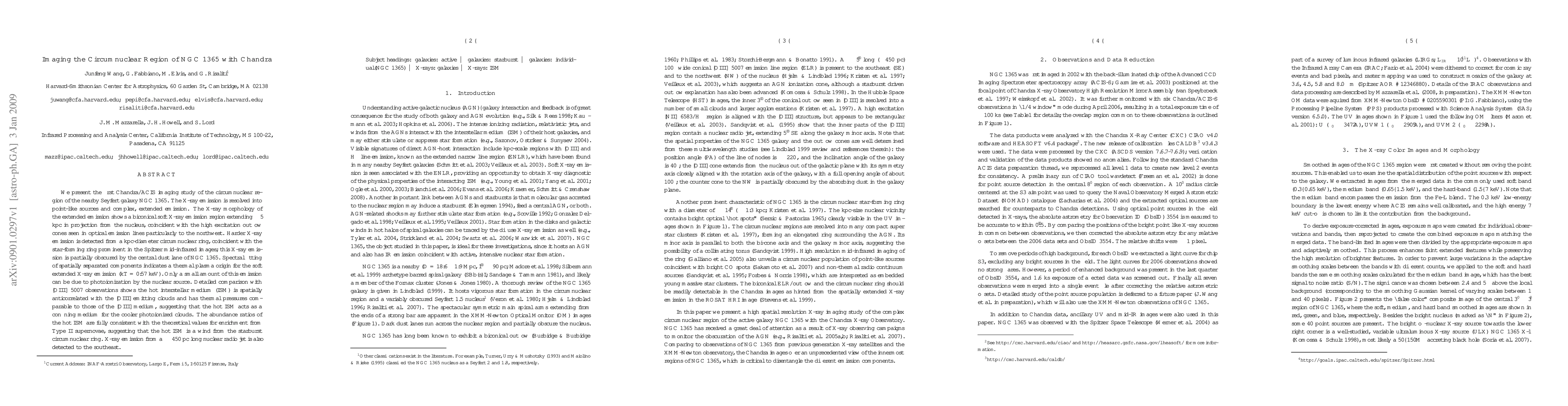 The Chandra X-ray study of NGC 1365 reveals a biconical soft X-ray structure aligned with optical outflow cones, and a kpc-sized hard X-ray ring linked to a star-forming region. The hot ISM (0.57 keV) is found to confine cooler photoionized clouds, with abundance patterns indicative of supernova enrichment. A nuclear radio jet also emits X-rays.