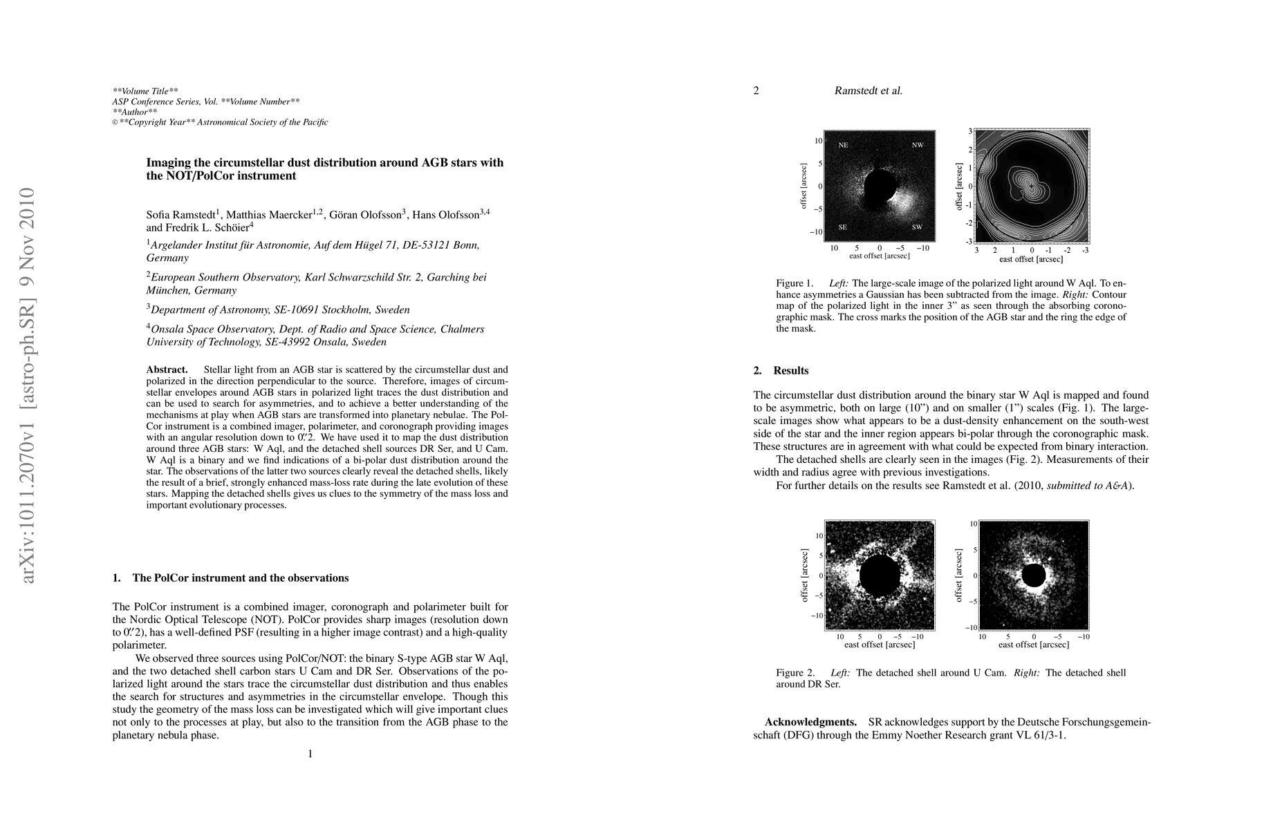 Stellar light from an AGB star is scattered by the circumstellar dust and polarized in the direction perpendicular to the source. Therefore, images of circumstellar envelopes around AGB stars in polarized light traces the dust distribution and can be used to search for asymmetries, and to achieve a better understanding of the mechanisms at play when AGB stars are transformed into planetary nebulae. The PolCor instrument is a combined imager, polarimeter, and coronograph providing images with an angular resolution down to 0.2". We have used it to map the dust distribution around three AGB stars: W Aql, and the detached shell sources DR Ser, and U Cam. W Aql is a binary and we find indications of a bi-polar dust distribution around the star. The observations of the latter two sources clearly reveal the detached shells, likely the result of a brief, strongly enhanced mass-loss rate during the late evolution of these stars. Mapping the detached shells gives us clues to the symmetry of the mass loss and important evolutionary processes.