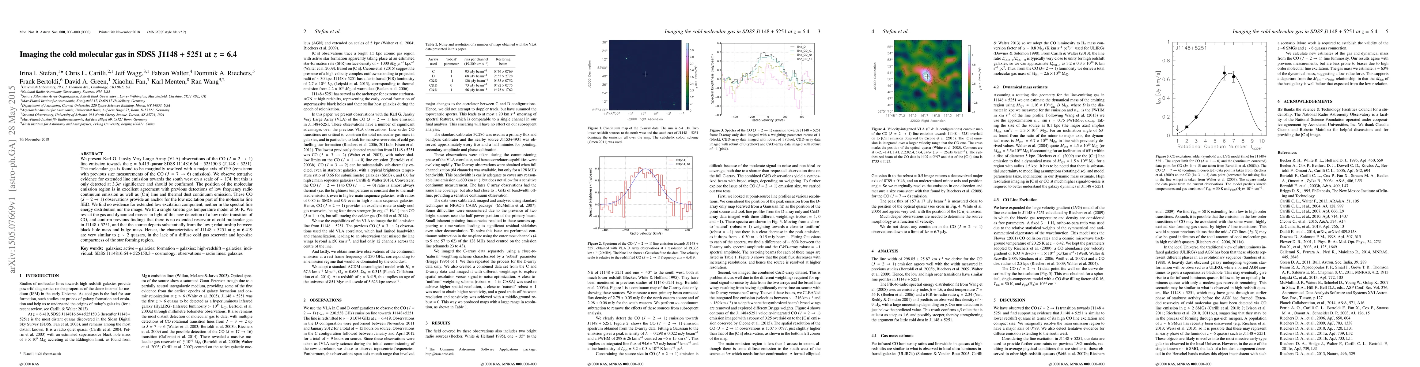 The study uses VLA observations to image cold molecular gas in the z=6.4 quasar SDSS J1148+5251, finding marginally resolved emission with a size consistent across different CO transitions. Tentative extended emission towards the south-west is noted but requires confirmation. The research confirms previous findings of no extended cold gas reservoir, and the quasar's characteristics resemble those of z~2 quasars, lacking a diffuse cold gas reservoir and showing compact star-forming regions.