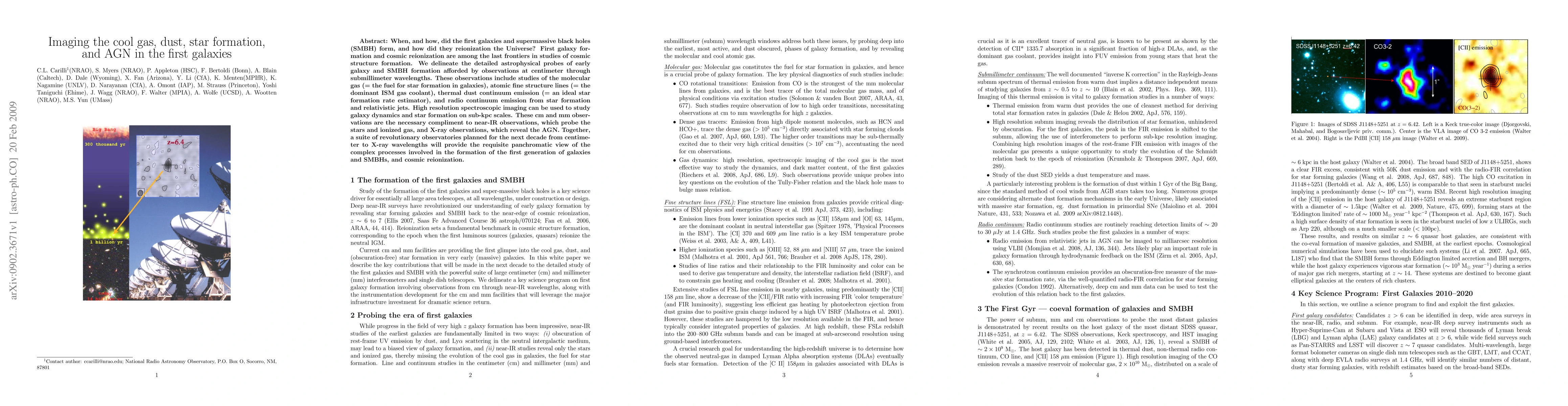 This paper explores the formation of the first galaxies and supermassive black holes (SMBHs) through observations at centimeter to submillimeter wavelengths, focusing on molecular gas, dust, and star formation indicators. It emphasizes the importance of a comprehensive panchromatic approach combining these observations with near-IR and X-ray data to understand early galaxy formation and cosmic reionization.