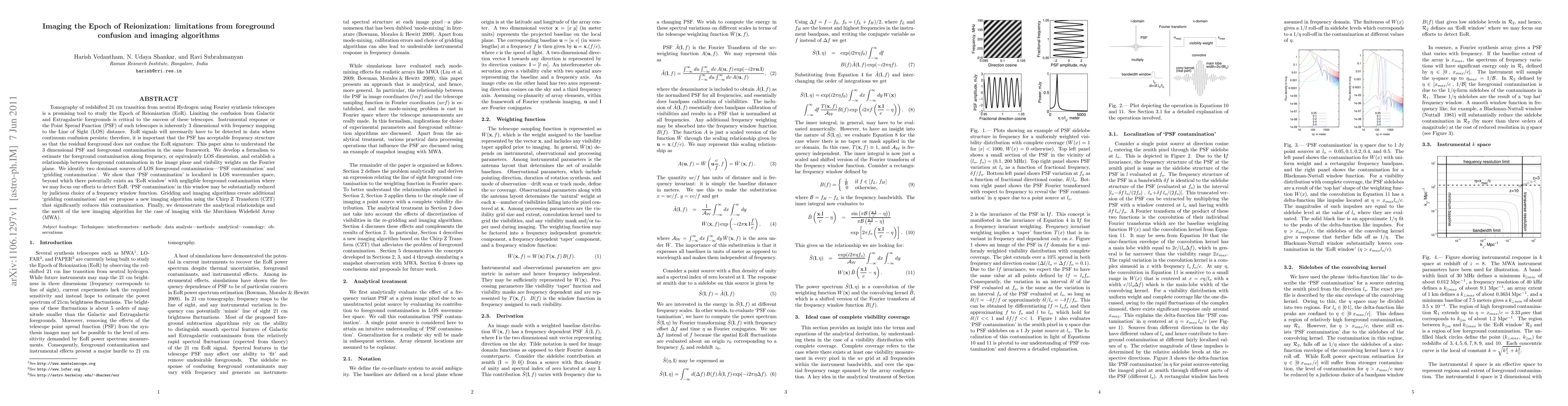 Tomography of redshifted 21 cm transition from neutral Hydrogen using Fourier synthesis telescopes is a promising tool to study the Epoch of Reionization (EoR). Limiting the confusion from Galactic and Extragalactic foregrounds is critical to the success of these telescopes. Instrumental response or the Point Spread Function (PSF) of such telescopes is inherently 3 dimensional with frequency mapping to the Line of Sight (LOS) distance. EoR signals will necessarily have to be detected in data where continuum confusion persists; therefore, it is important that the PSF has acceptable frequency structure so that the residual foreground does not confuse the EoR signature. This paper aims to understand the 3 dimensional PSF and foreground contamination in the same framework. We develop a formalism to estimate the foreground contamination along frequency, or equivalently LOS dimension, and establish a relationship between foreground contamination in the image plane and visibility weights on the Fourier plane. We identify two dominant sources of LOS foreground contamination-'PSF contamination' and 'gridding contamination'. We show that 'PSF contamination' is localized in LOS wavenumber space, beyond which there potentially exists an 'EoR window' with negligible foreground contamination where we may focus our efforts to detect EoR. 'PSF contamination' in this window may be substantially reduced by judicious choice of a frequency window function. Gridding and imaging algorithms create additional 'gridding contamination' and we propose a new imaging algorithm using the Chirp Z Transform (CZT) that significantly reduces this contamination. Finally, we demonstrate the analytical relationships and the merit of the new imaging algorithm for the case of imaging with the Murchison Widefield Array (MWA).