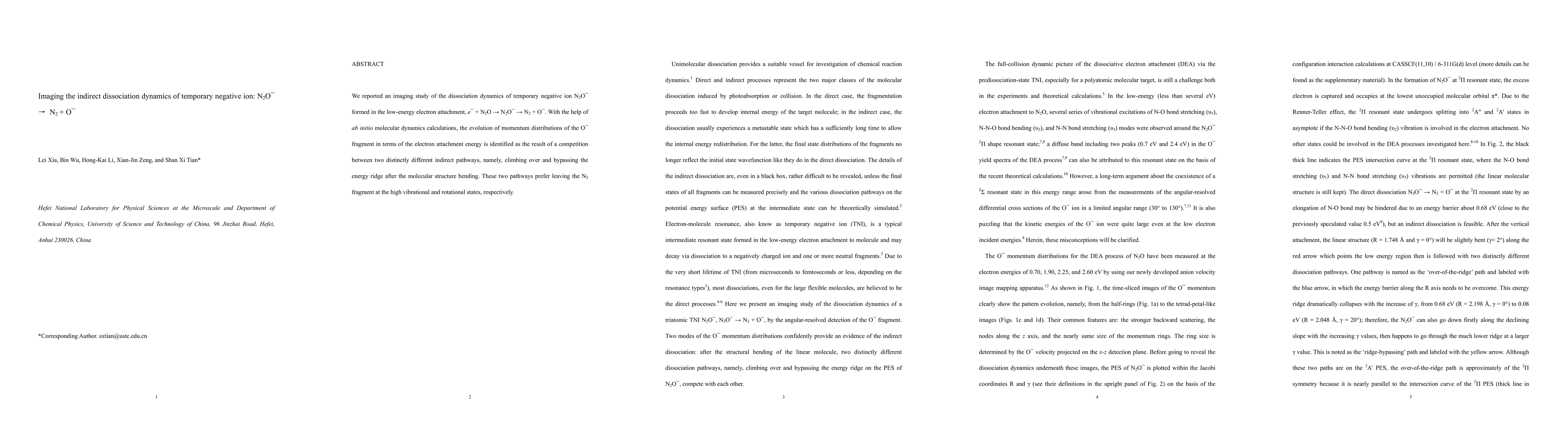 We reported an imaging study of the dissociation dynamics of temporary negative ion N2O- formed in the low-energy electron attachment, e- + N2O -> N2O- -> N2 + O-. With the help of ab initio molecular dynamics calculations, the evolution of momentum distributions of the O- fragment in terms of the electron attachment energy is identified as the result of a competition between two distinctly different indirect pathways, namely, climbing over and bypassing the energy ridge after the molecular structure bending. These two pathways prefer leaving the N2 fragment at the high vibrational and rotational states, respectively.