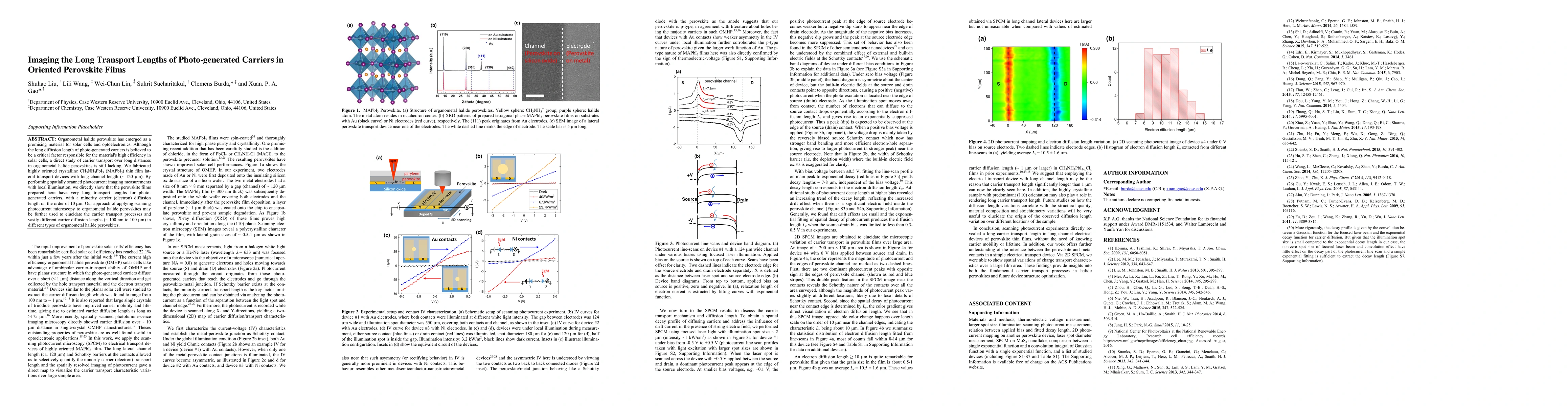 This paper demonstrates that oriented perovskite films exhibit exceptionally long transport lengths for photo-generated carriers, with electron diffusion lengths around 10 μm, using spatially scanned photocurrent imaging. The technique may be applied to study carrier transport across various perovskite materials.