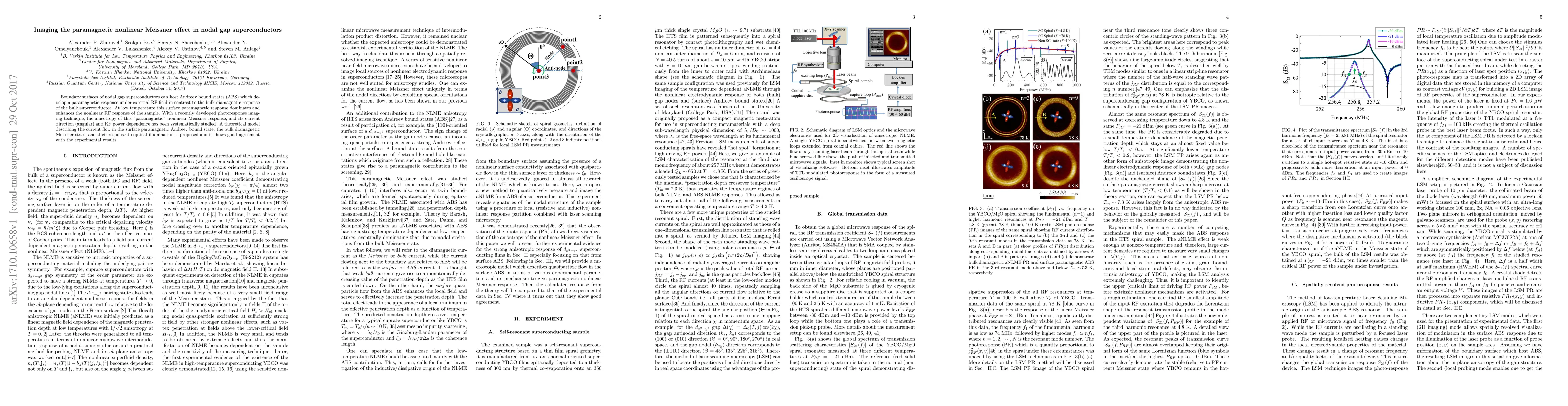 Boundary surfaces of nodal gap superconductors can host Andreev bound states (ABS) which develop a paramagnetic response under external RF field in contrast to the bulk diamagnetic response of the bulk superconductor. At low temperature this surface paramagnetic response dominates and enhances the nonlinear RF response of the sample. With a recently developed photoresponse imaging technique, the anisotropy of this "paramagnetic" nonlinear Meissner response, and its current direction (angular) and RF power dependence has been systematically studied. A theoretical model describing the current flow in the surface paramagnetic Andreev bound state, the bulk diamagnetic Meissner state, and their response to optical illumination is proposed and it shows good agreement with the experimental results.