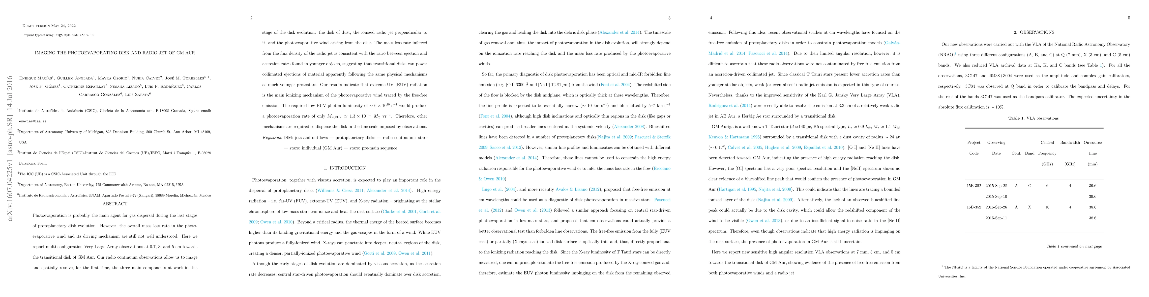 Photoevaporation is probably the main agent for gas dispersal during the last stages of protoplanetary disk evolution. However, the overall mass loss rate in the photoevaporative wind and its driving mechanism are still not well understood. Here we report multi-configuration Very Large Array observations at 0.7, 3, and 5 cm towards the transitional disk of GM Aur. Our radio continuum observations allow us to image and spatially resolve, for the first time, the three main components at work in this stage of the disk evolution: the disk of dust, the ionized radio jet perpendicular to it, and the photoevaporative wind arising from the disk. The mass loss rate inferred from the flux density of the radio jet is consistent with the ratio between ejection and accretion rates found in younger objects, suggesting that transitional disks can power collimated ejections of material apparently following the same physical mechanisms as much younger protostars. Our results indicate that extreme-UV (EUV) radiation is the main ionizing mechanism of the photoevaporative wind traced by the free-free emission. The required low EUV photon luminosity of $\sim6\times10^{40}$ s$^{-1}$ would produce a photoevaporation rate of only $\dot{M}_{\rm w,EUV}\simeq1.3\times10^{-10}~M_{\odot}$ yr$^{-1}$. Therefore, other mechanisms are required to disperse the disk in the timescale imposed by observations.