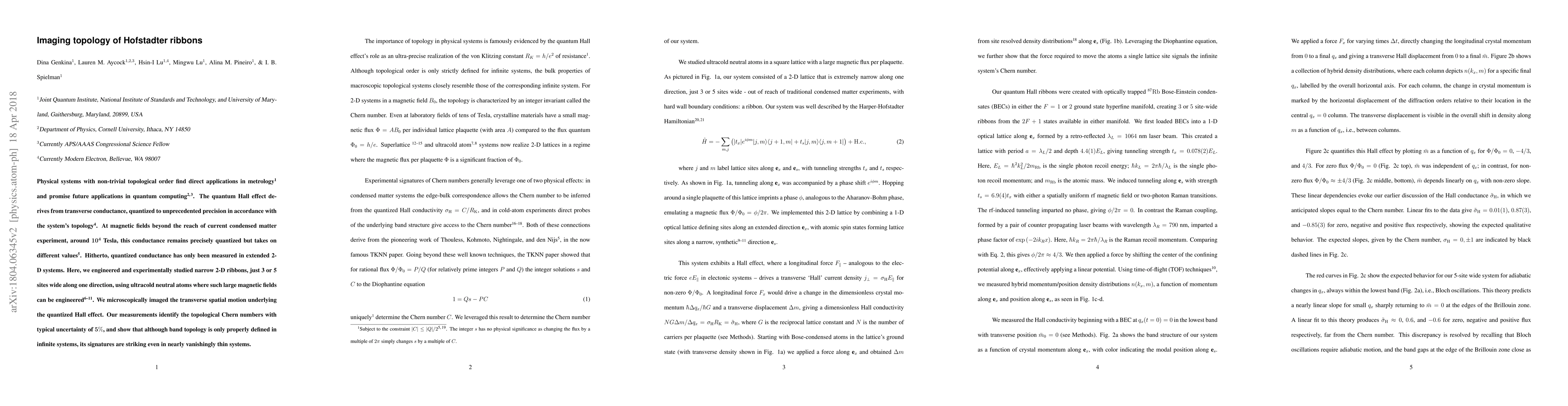 Physical systems with non-trivial topological order find direct applications in metrology[1] and promise future applications in quantum computing[2,3]. The quantum Hall effect derives from transverse conductance, quantized to unprecedented precision in accordance with the system's topology[4]. At magnetic fields beyond the reach of current condensed matter experiment, around 10^4 Tesla, this conductance remains precisely quantized but takes on different values[5]. Hitherto, quantized conductance has only been measured in extended 2-D systems. Here, we engineered and experimentally studied narrow 2-D ribbons, just 3 or 5 sites wide along one direction, using ultracold neutral atoms where such large magnetic fields can be engineered[6-11]. We microscopically imaged the transverse spatial motion underlying the quantized Hall effect. Our measurements identify the topological Chern numbers with typical uncertainty of 5%, and show that although band topology is only properly defined in infinite systems, its signatures are striking even in nearly vanishingly thin systems.