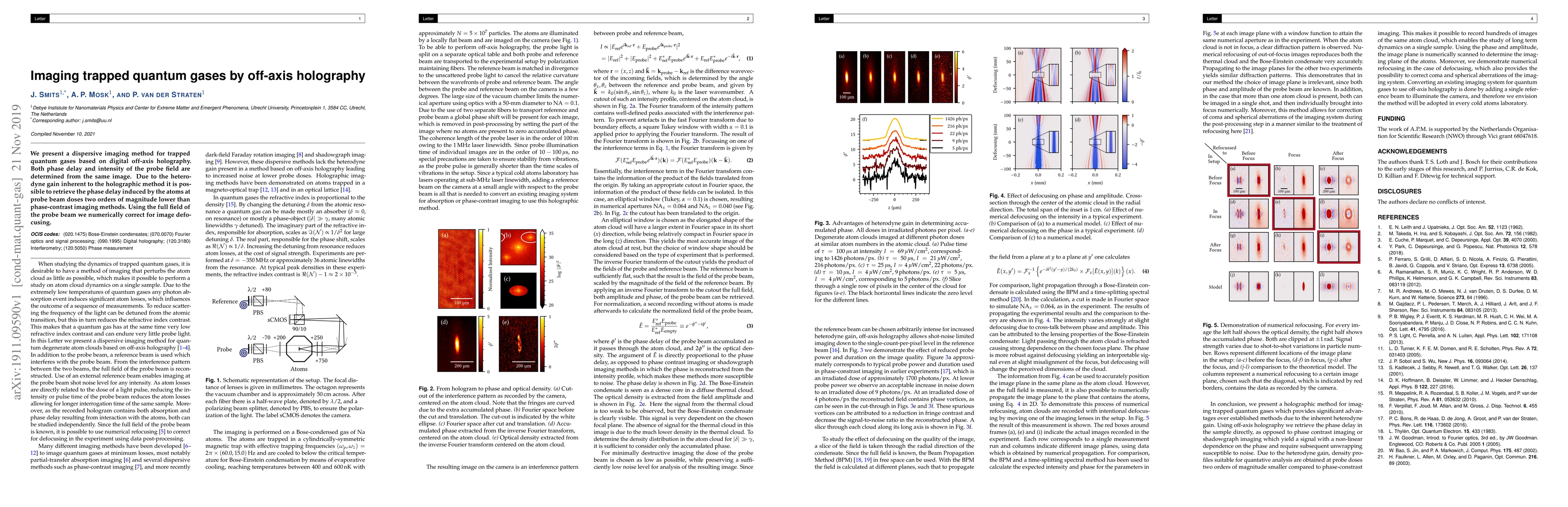 We present a dispersive imaging method for trapped quantum gases based on digital off-axis holography. Both phase delay and intensity of the probe field are determined from the same image. Due to the heterodyne gain inherent to the holographic method it is possible to retrieve the phase delay induced by the atoms at probe beam doses two orders of magnitude lower than phase-contrast imaging methods. Using the full field of the probe beam we numerically correct for image defocusing.