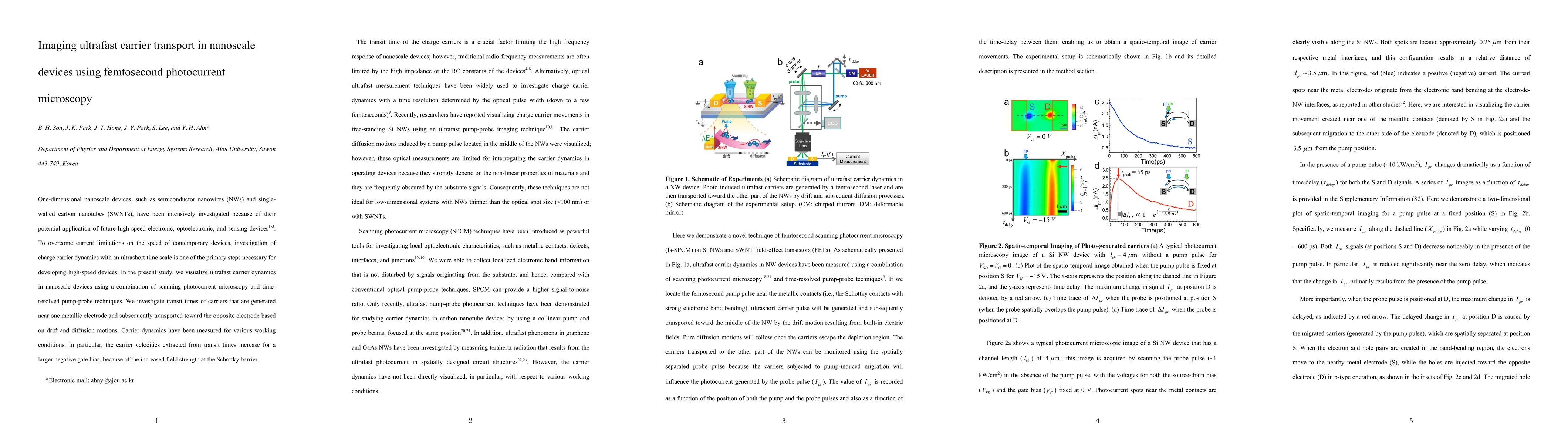 This paper employs femtosecond photocurrent microscopy and time-resolved pump-probe techniques to visualize ultrafast carrier transport in one-dimensional nanoscale devices like semiconductor nanowires and carbon nanotubes. The study finds that carrier velocities increase with a larger negative gate bias due to enhanced field strength at the Schottky barrier.