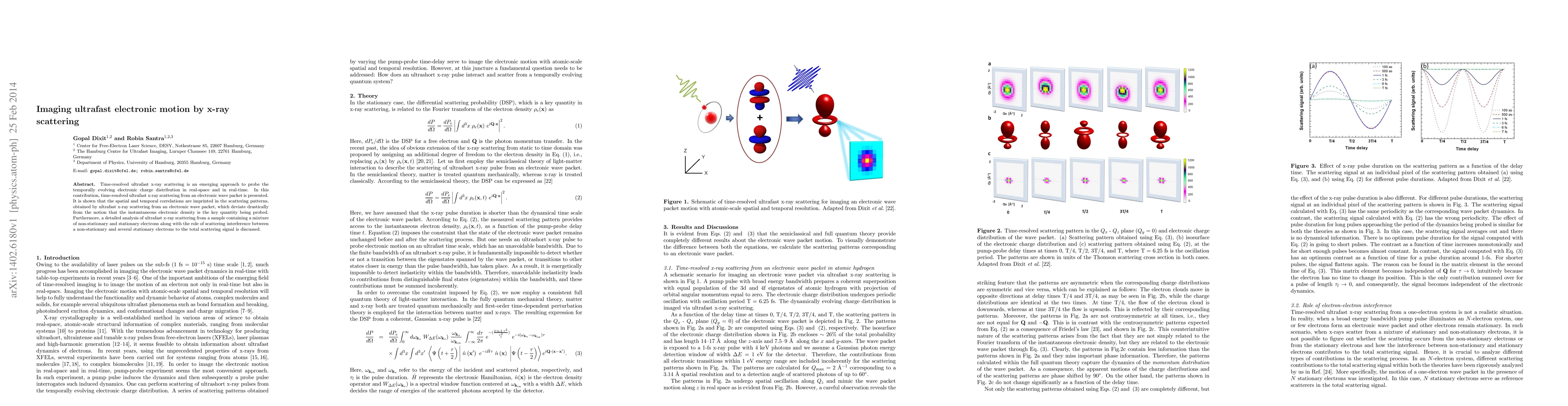 This paper explores time-resolved ultrafast x-ray scattering to study electronic charge distribution changes, revealing spatial and temporal correlations not captured by traditional instantaneous density models. It also examines scattering interference effects from non-stationary and stationary electrons in mixed samples.