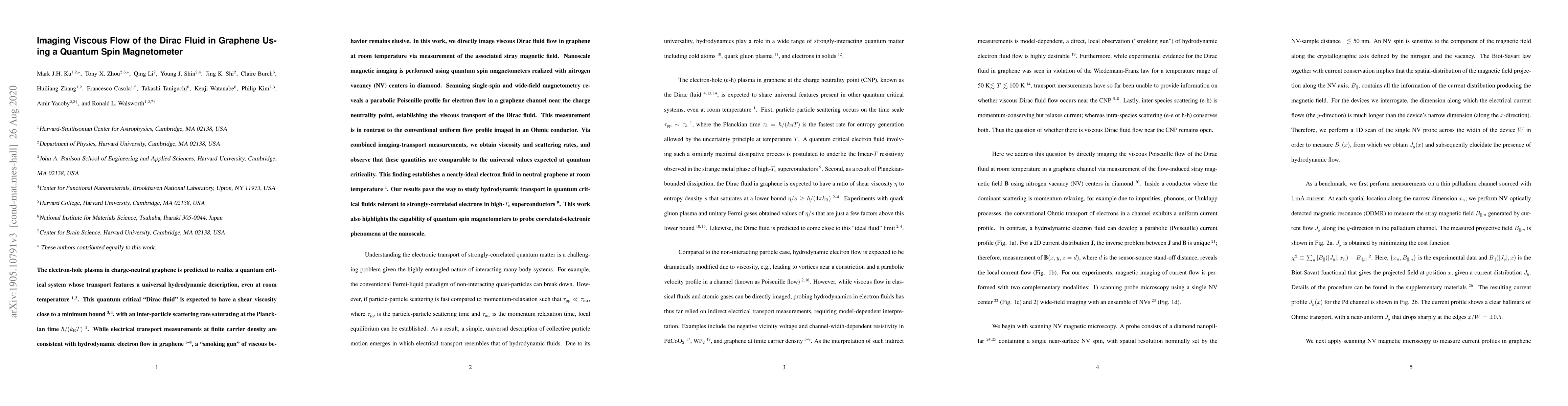 This paper demonstrates direct imaging of viscous flow in graphene's Dirac fluid at room temperature using nanoscale magnetic imaging with NV centers in diamond, revealing a parabolic flow profile indicative of hydrodynamic transport. The findings support the existence of a nearly-ideal electron fluid near quantum criticality.
