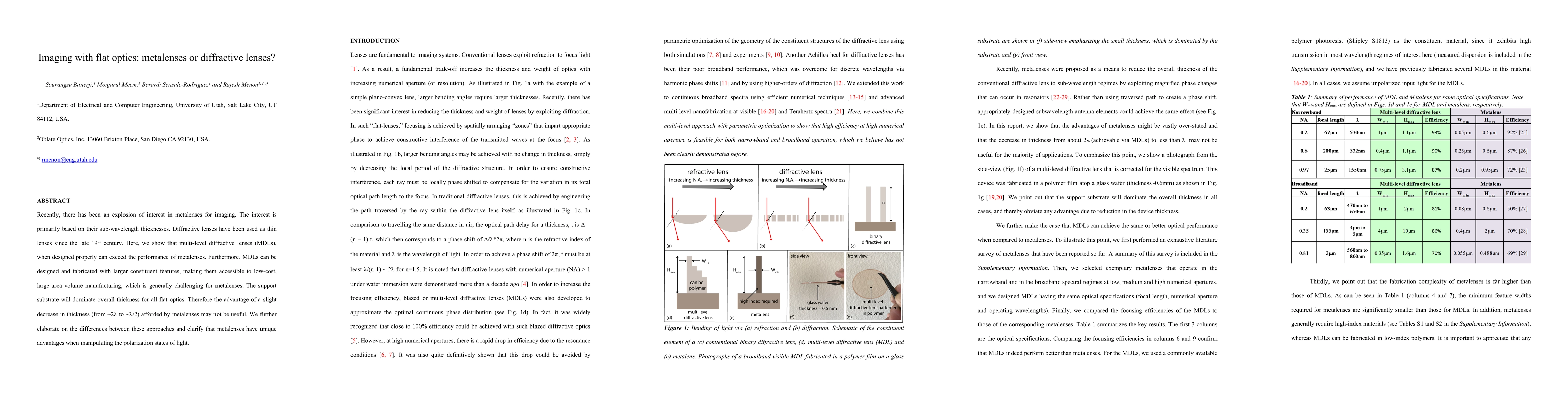 Recently, there has been an explosion of interest in metalenses for imaging. The interest is primarily based on their sub-wavelength thicknesses. Diffractive lenses have been used as thin lenses since the late 19th century. Here, we show that multi-level diffractive lenses (MDLs), when designed properly can exceed the performance of metalenses. Furthermore, MDLs can be designed and fabricated with larger constituent features, making them accessible to low-cost, large area volume manufacturing, which is generally challenging for metalenses. The support substrate will dominate overall thickness for all flat optics. Therefore the advantage of a slight decrease in thickness (from ~2{\lambda} to ~{\lambda}/2) afforded by metalenses may not be useful. We further elaborate on the differences between these approaches and clarify that metalenses have unique advantages when manipulating the polarization states of light.