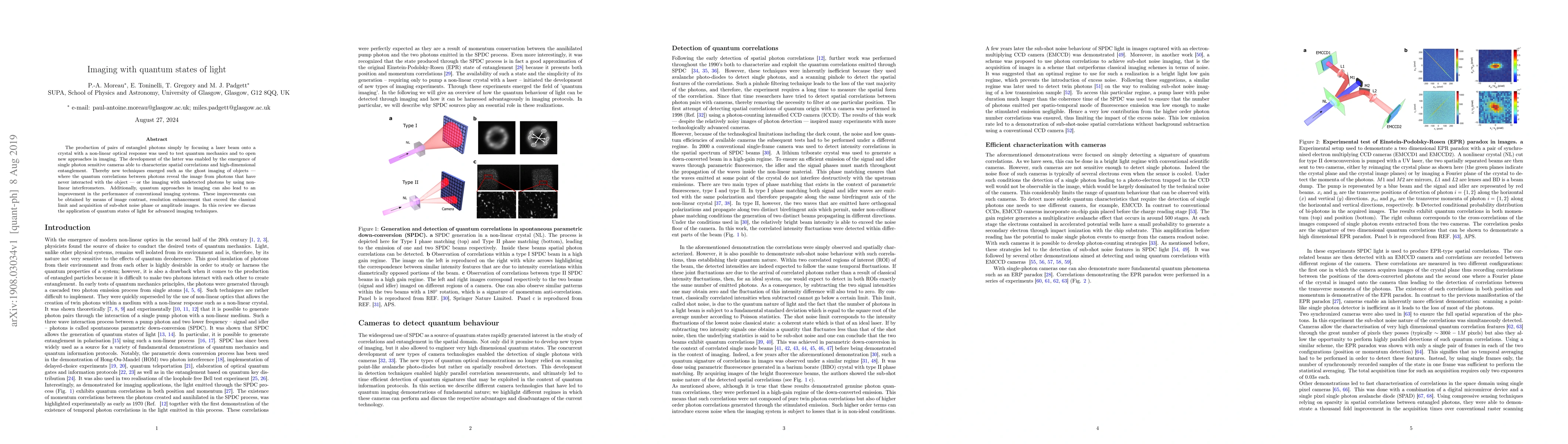 The production of pairs of entangled photons simply by focusing a laser beam onto a crystal with a non-linear optical response was used to test quantum mechanics and to open new approaches in imaging. The development of the latter was enabled by the emergence of single photon sensitive cameras able to characterize spatial correlations and high-dimensional entanglement. Thereby new techniques emerged such as the ghost imaging of objects - where the quantum correlations between photons reveal the image from photons that have never interacted with the object - or the imaging with undetected photons by using nonlinear interferometers. Additionally, quantum approaches in imaging can also lead to an improvement in the performance of conventional imaging systems. These improvements can be obtained by means of image contrast, resolution enhancement that exceed the classical limit and acquisition of sub-shot noise phase or amplitude images. In this review we discuss the application of quantum states of light for advanced imaging techniques.