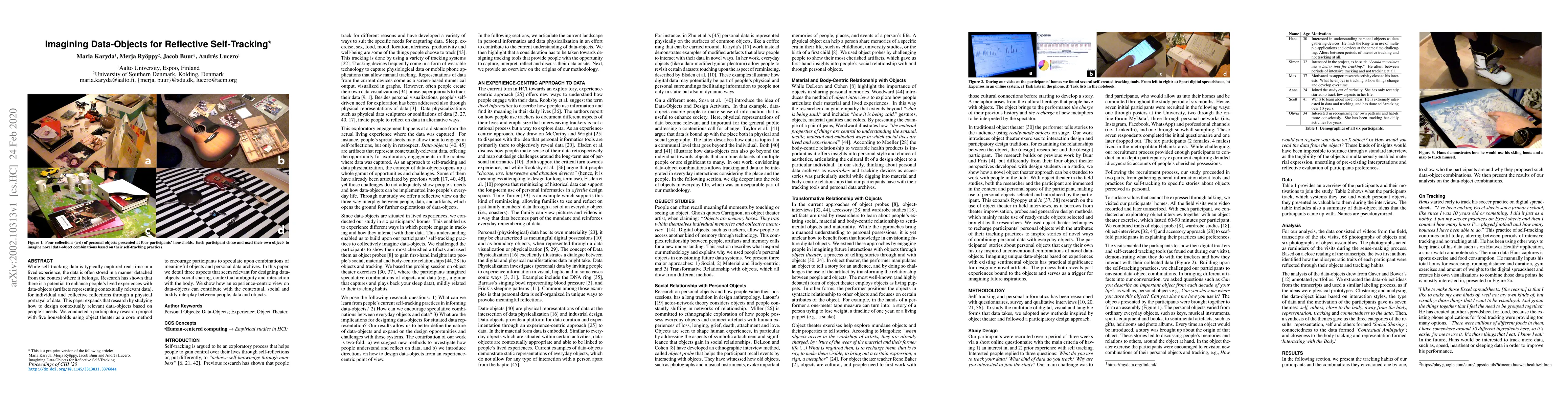 Researchers designed data-objects to enhance self-tracking experiences, finding key aspects include social sharing, contextual ambiguity, and interaction with the body. Their approach uses object theater to encourage participants to create meaningful combinations of objects and personal data archives.