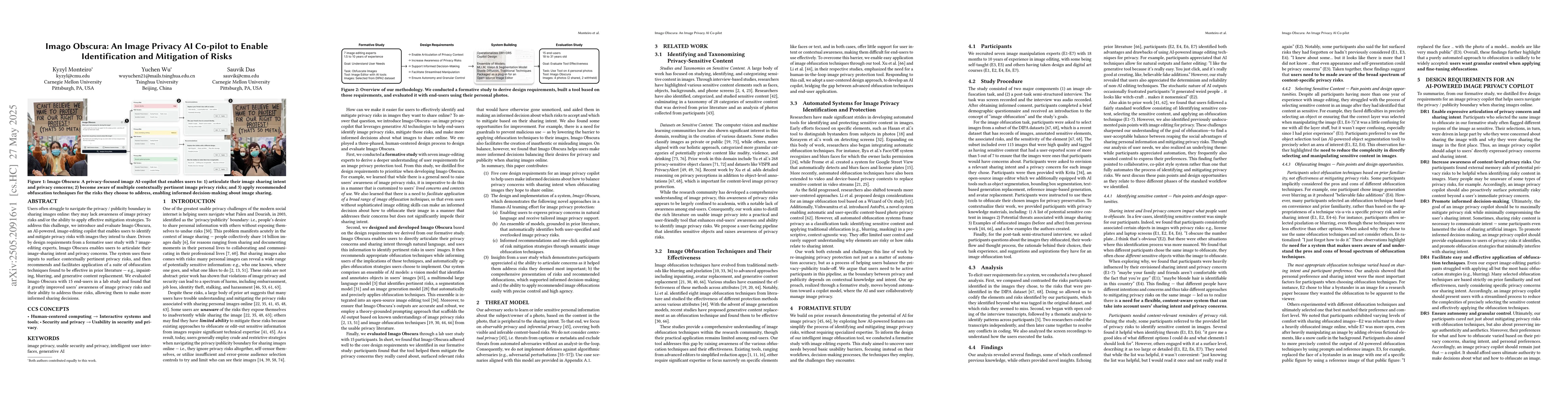 Imago Obscura, an AI-powered image-editing copilot that identifies and mitigates privacy risks in images by recommending and facilitating the application of obfuscation techniques.