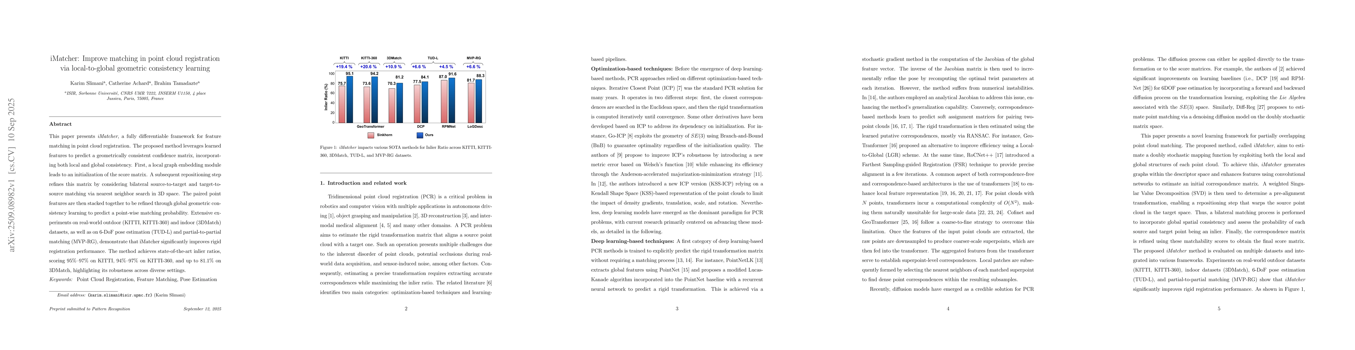 This paper presents iMatcher, a fully differentiable framework for feature matching in point cloud registration. The proposed method leverages learned features to predict a geometrically consistent confidence matrix, incorporating both local and global consistency. First, a local graph embedding module leads to an initialization of the score matrix. A subsequent repositioning step refines this matrix by considering bilateral source-to-target and target-to-source matching via nearest neighbor search in 3D space. The paired point features are then stacked together to be refined through global geometric consistency learning to predict a point-wise matching probability. Extensive experiments on real-world outdoor (KITTI, KITTI-360) and indoor (3DMatch) datasets, as well as on 6-DoF pose estimation (TUD-L) and partial-to-partial matching (MVP-RG), demonstrate that iMatcher significantly improves rigid registration performance. The method achieves state-of-the-art inlier ratios, scoring 95% - 97% on KITTI, 94% - 97% on KITTI-360, and up to 81.1% on 3DMatch, highlighting its robustness across diverse settings.