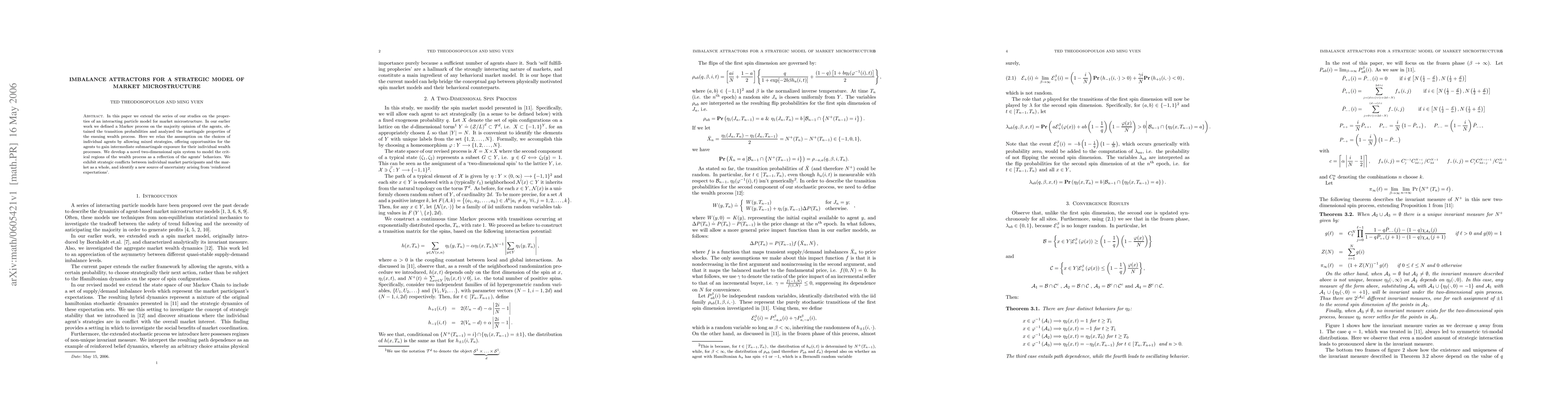 In this paper we extend the series of our studies on the properties of an interacting particle model for market microstructure. In our earlier work we defined a Markov process on the majority opinion of the agents, obtained the transition probabilities and analyzed the martingale properties of the ensuing wealth process. Here we relax the assumption on the choices of individual agents by allowing mixed strategies, offering opportunities for the agents to gain intermediate submartingale exposure for their individual wealth processes. We develop a novel two-dimensional spin system to model the critical regions of the wealth process as a reflection of the agents' behaviors. We exhibit strategic conflicts between individual market participants and the market as a whole, and identify a new source of uncertainty arising from `reinforced expectations'.
