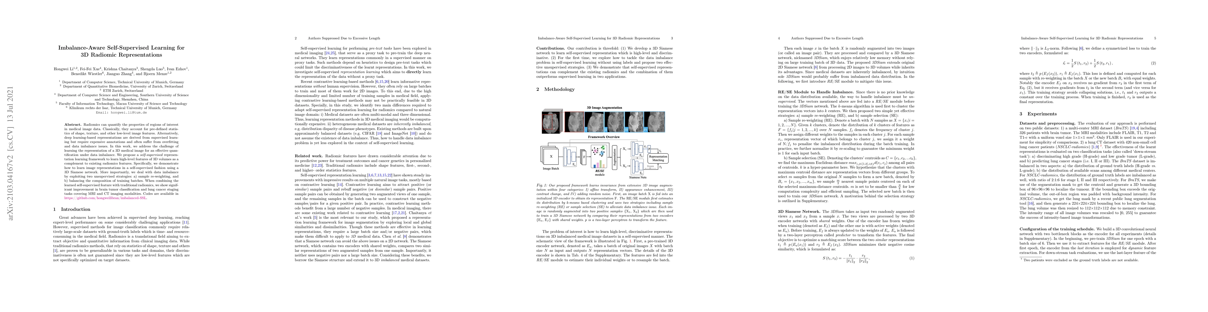 This paper proposes a self-supervised learning framework to address data imbalance in 3D radiomic representations for medical images, using a 3D Siamese network. It employs sample re-weighting and balanced training batches to mitigate imbalance, showing significant improvements in brain tumor classification and lung cancer staging.