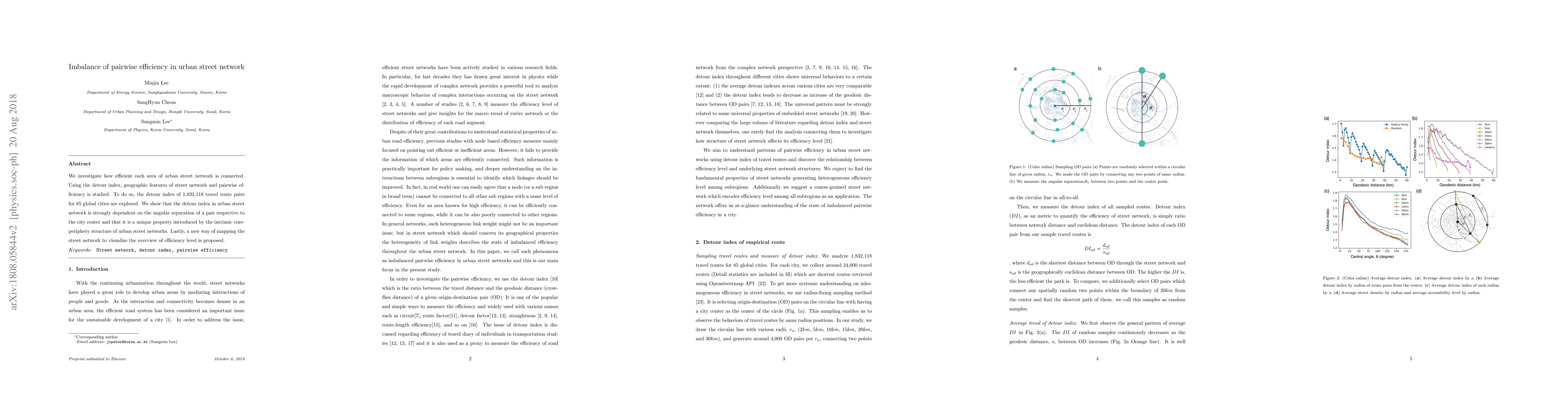 This paper examines the efficiency of urban street networks using the detour index for 1,832,118 travel route pairs across 85 global cities, revealing a strong correlation between the detour index and the angular separation from the city center, highlighting the core-periphery structure. A new visualization method is proposed to map the efficiency levels of the street network.