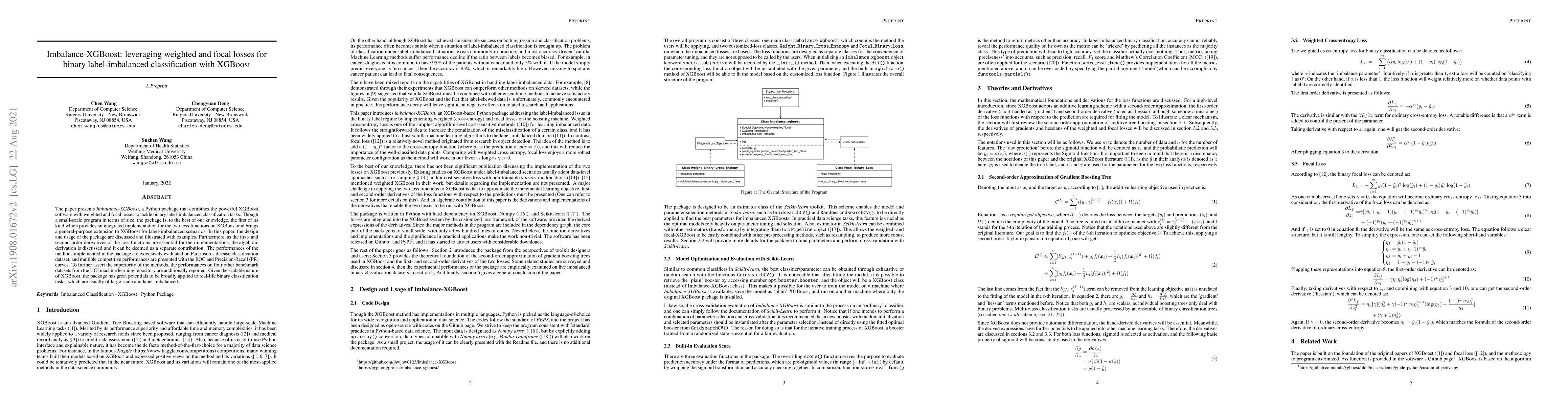 The paper introduces Imbalance-XGBoost, a Python package that integrates XGBoost with weighted and focal losses to address binary label-imbalanced classification. It showcases the package's design, usage, and successful application in Parkinson's disease classification, demonstrating its potential for large-scale, real-life tasks.