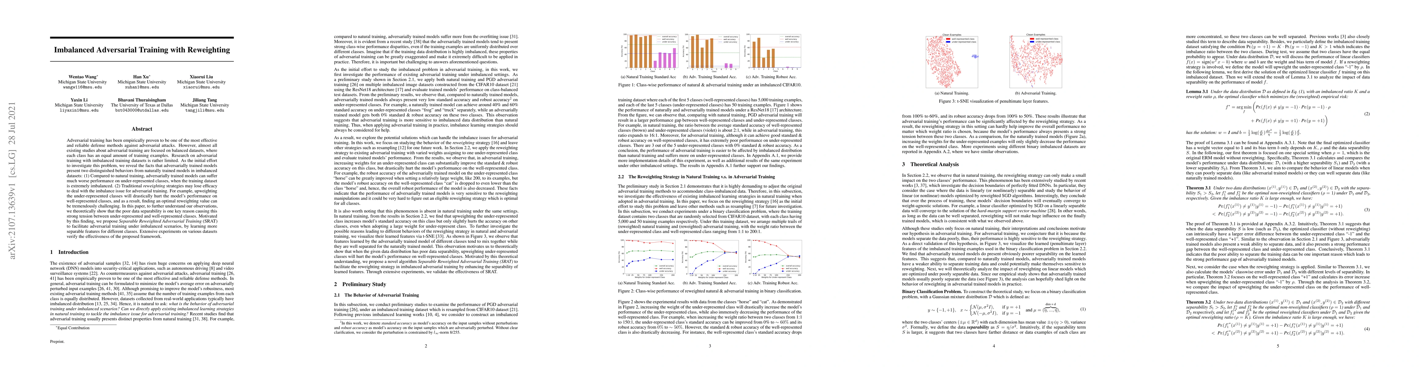 This paper investigates adversarial training on imbalanced datasets, noting that traditional methods struggle with under-represented classes. It proposes Separable Reweighted Adversarial Training (SRAT) to improve feature separability, thereby enhancing model performance on both under-represented and well-represented classes, as verified by experiments on multiple datasets.