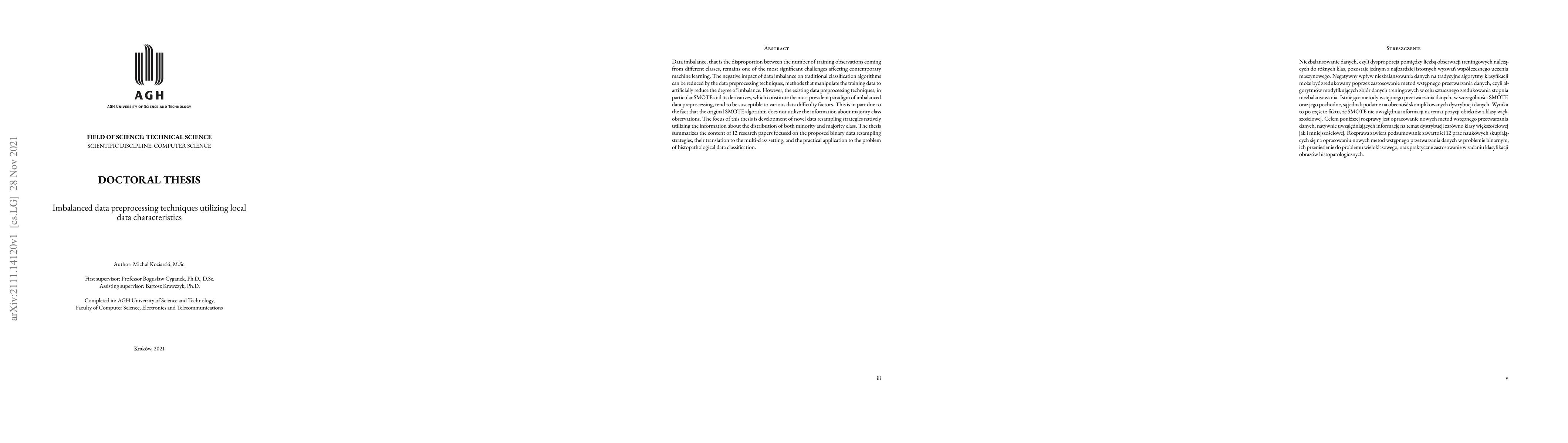 This paper explores novel data preprocessing techniques to address data imbalance in machine learning, particularly focusing on strategies that leverage local data characteristics. It proposes new binary data resampling methods that utilize both minority and majority class distributions, and extends these to multi-class settings, demonstrating their application in histopathological data classification.