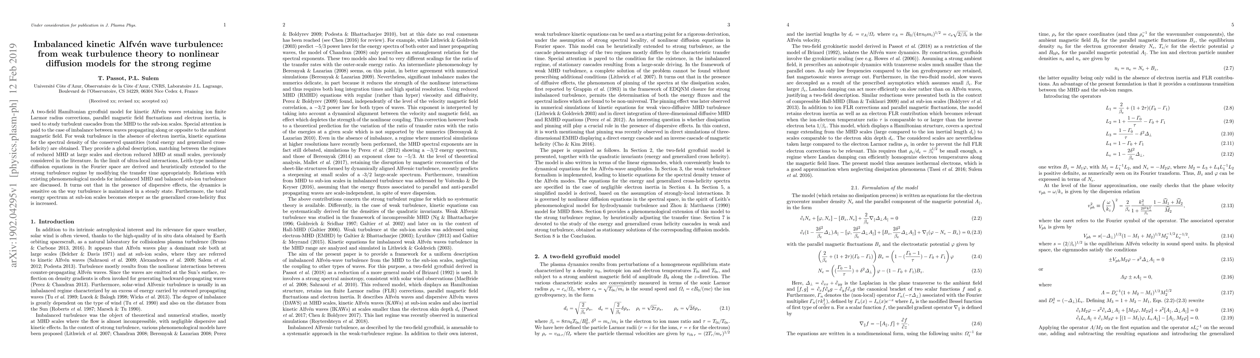 A two-field Hamiltonian gyrofluid model for kinetic Alfv\'en waves retaining ion finite Larmor radius corrections, parallel magnetic field fluctuations and electron inertia, is used to study turbulent cascades from the MHD to the sub-ion scales. Special attention is paid to the case of imbalance between waves propagating along or opposite to the ambient magnetic field. For weak turbulence in the absence of electron inertia, kinetic equations for the spectral density of the conserved quantities (total energy and generalized cross-helicity) are obtained. They provide a global description, matching between the regimes of reduced MHD at large scales and electron reduced MHD at small scales, previously considered in the literature. In the limit of ultra-local interactions, Leith-type nonlinear diffusion equations in the Fourier space are derived and heuristically extended to the strong turbulence regime by modifying the transfer time appropriately. Relations with existing phenomenological models for imbalanced MHD and balanced sub-ion turbulence are discussed. It turns out that in the presence of dispersive effects, the dynamics is sensitive on the way turbulence is maintained in a steady state. Furthermore, the total energy spectrum at sub-ion scales becomes steeper as the generalized cross-helicity flux is increased.